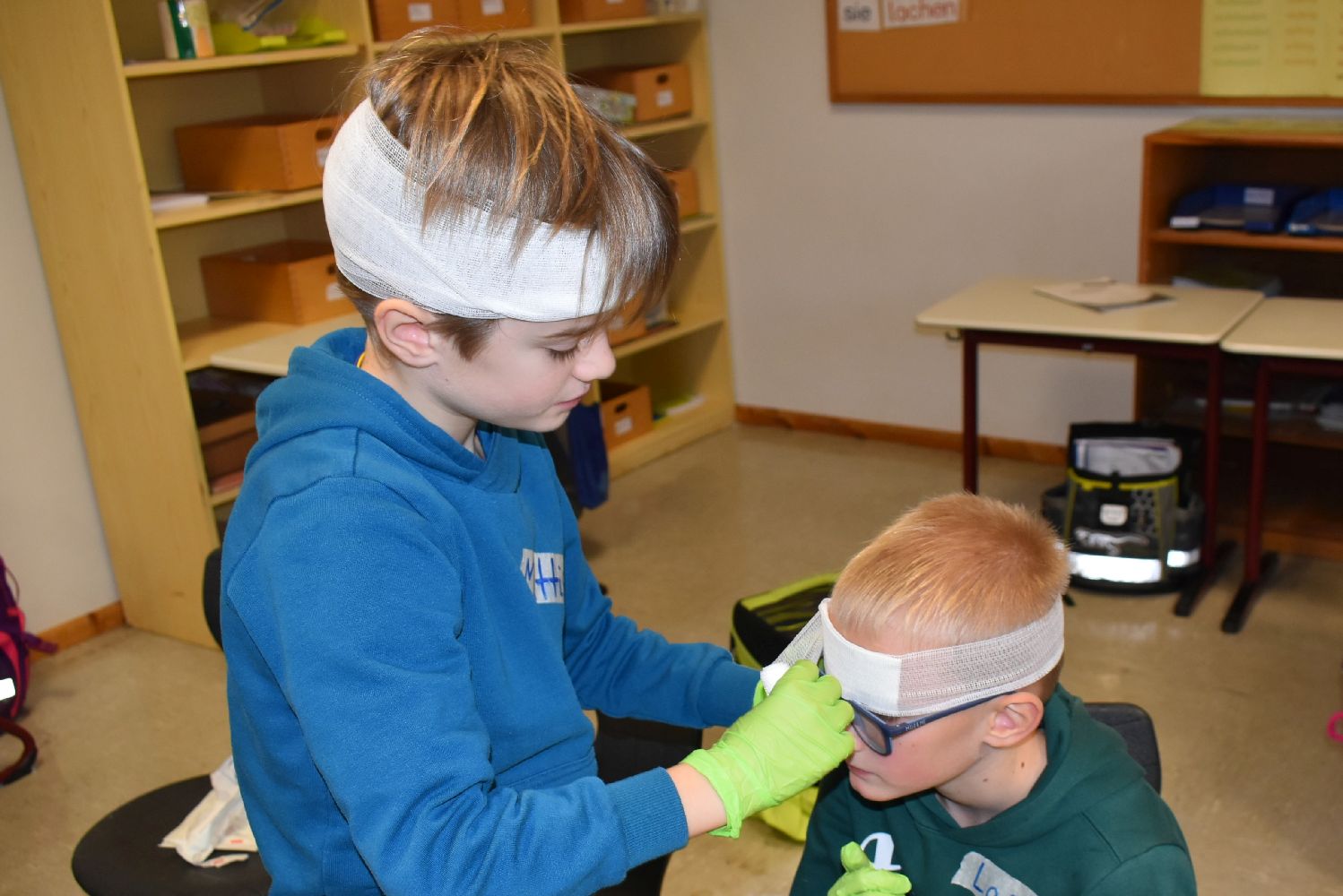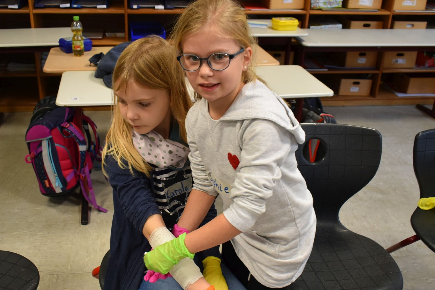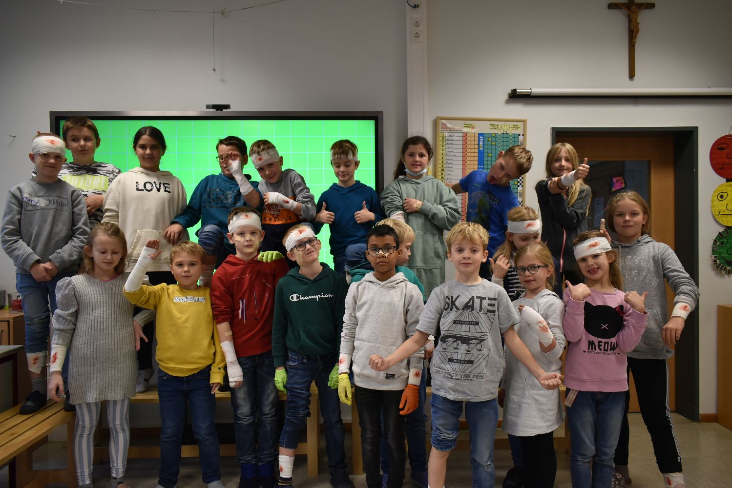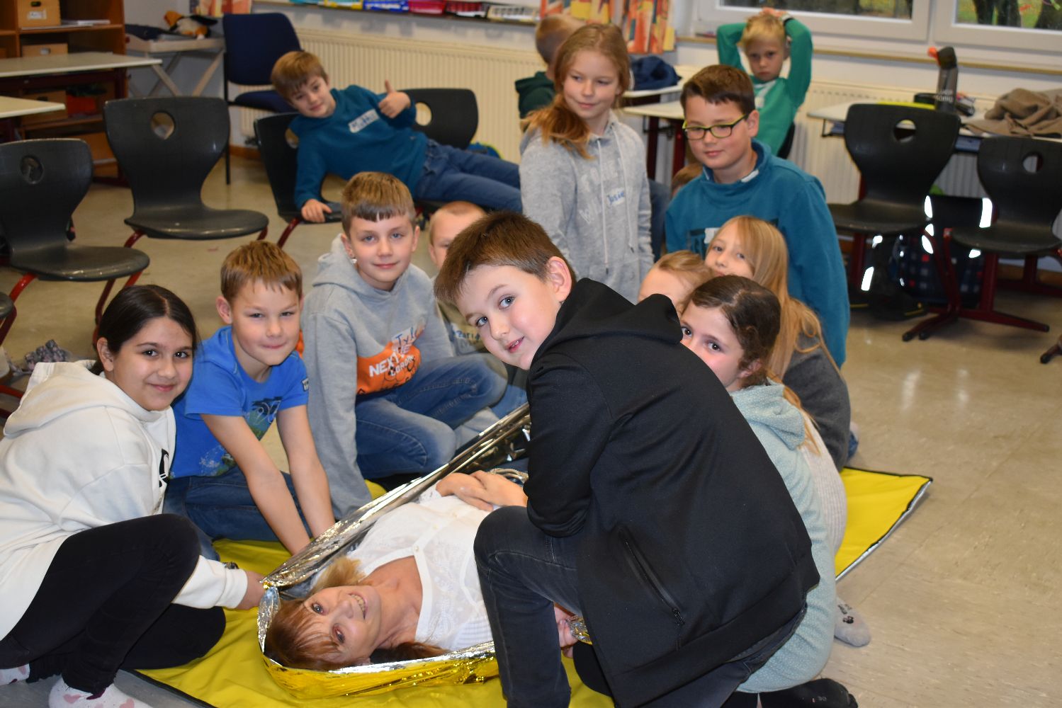 Dank der Unterstützung der Johanniter wurden die Kinder unserer Schulgemeinschaft klassenweise an die Erste Hilfe bei Verletzungen spielerisch herangeführt. Während des Kurses lernten die Kinder, wie sie über 112 einen Notruf absetzen, wie die stabile Seitenlage funktioniert, wie man einen Verletzten sicher transportiert und wie man Verbände anlegt. Ritualisierte Handlungen vermittelten den Kindern anschaulich die Schritte in der Ersten Hilfe. Der Reihe nach versuchten sich die Kinder als Ersthelfer oder schlüpften in die Rolle eines Verletzten. Durch die Wiederholung gewannen die Kinder schnell an Sicherheit. Dadurch können Berührungsängste frühzeitig abgebaut werden. Nicht zu unterschätzen ist dabei auch die Förderung der sozialen Kompetenzen, denn beim praktischen Tun musste sich jeder auf den anderen verlassen können.