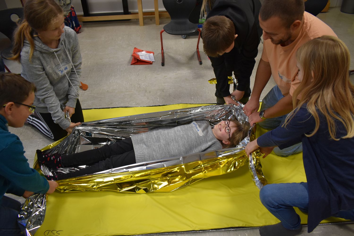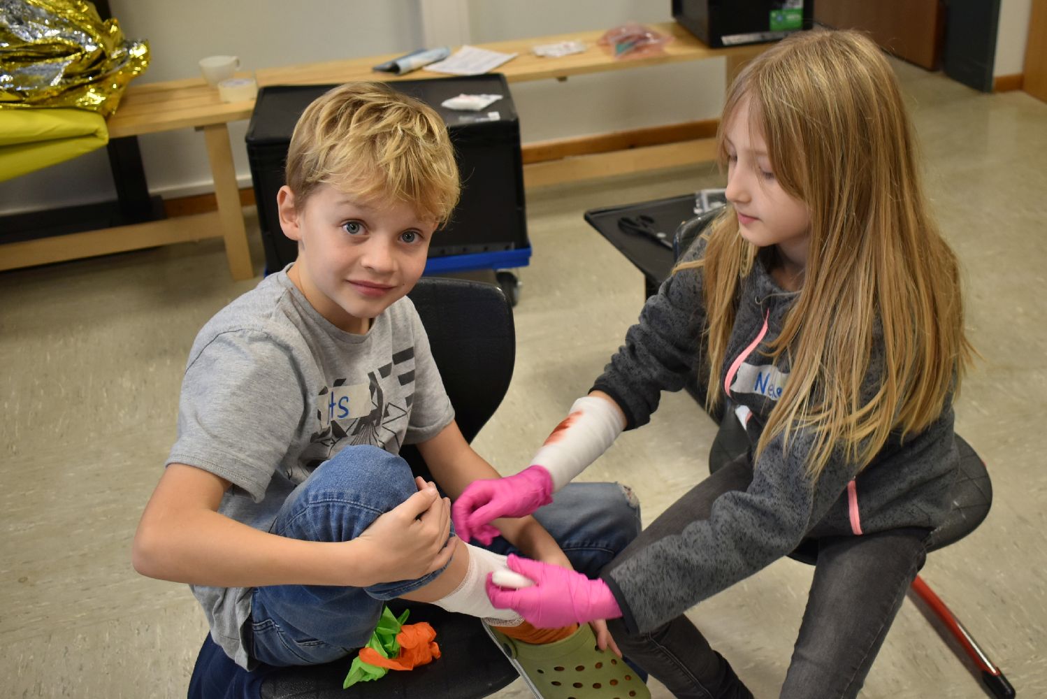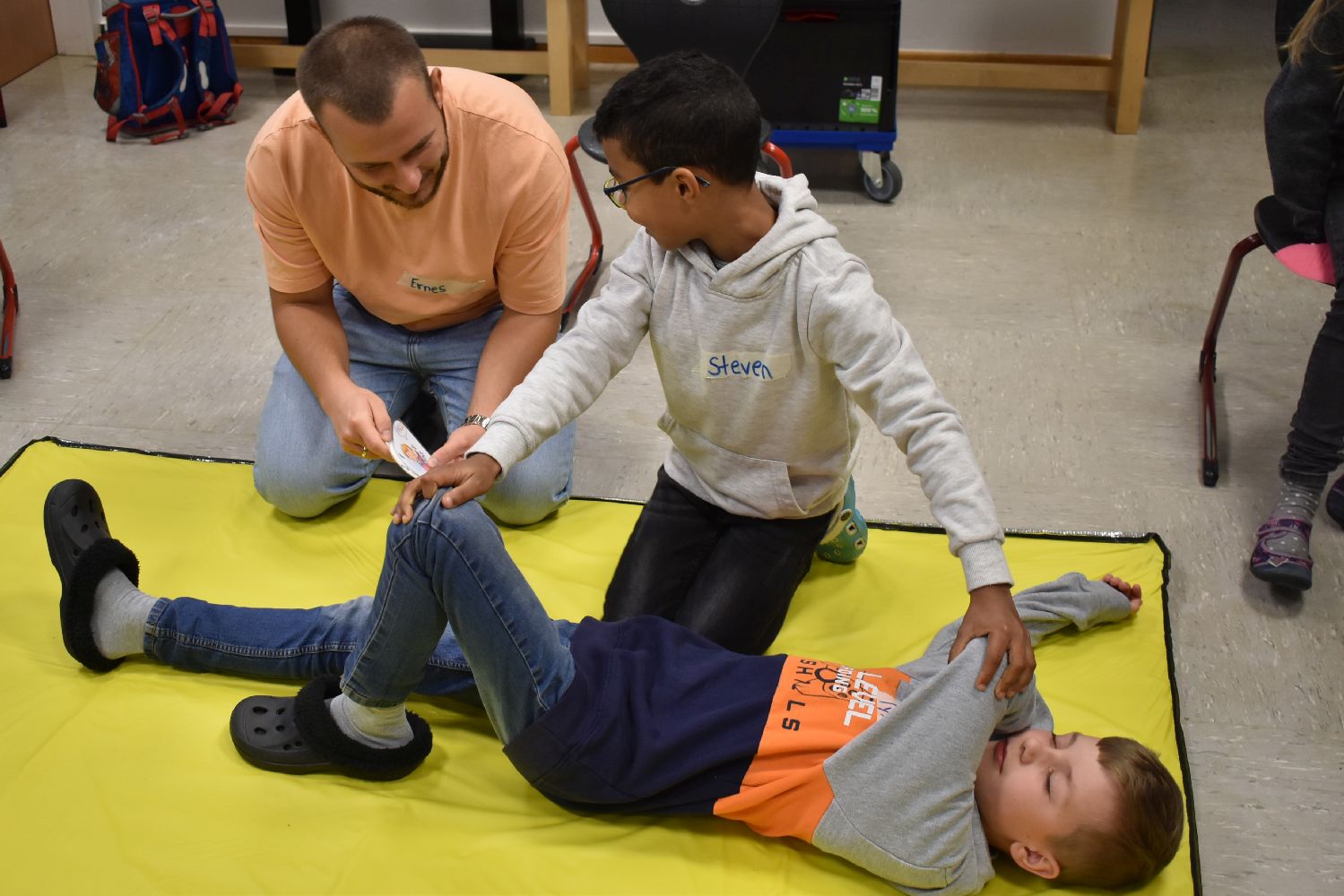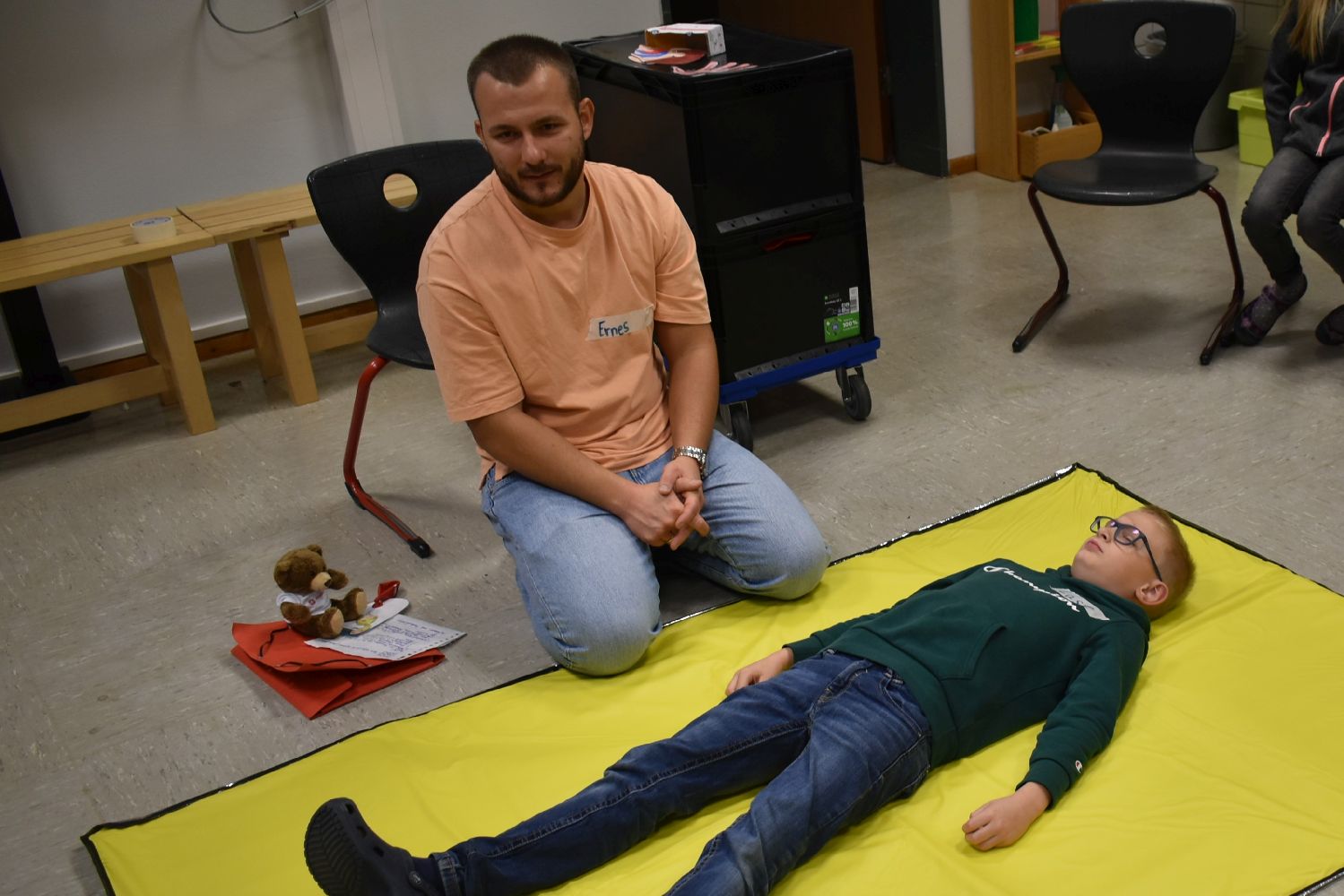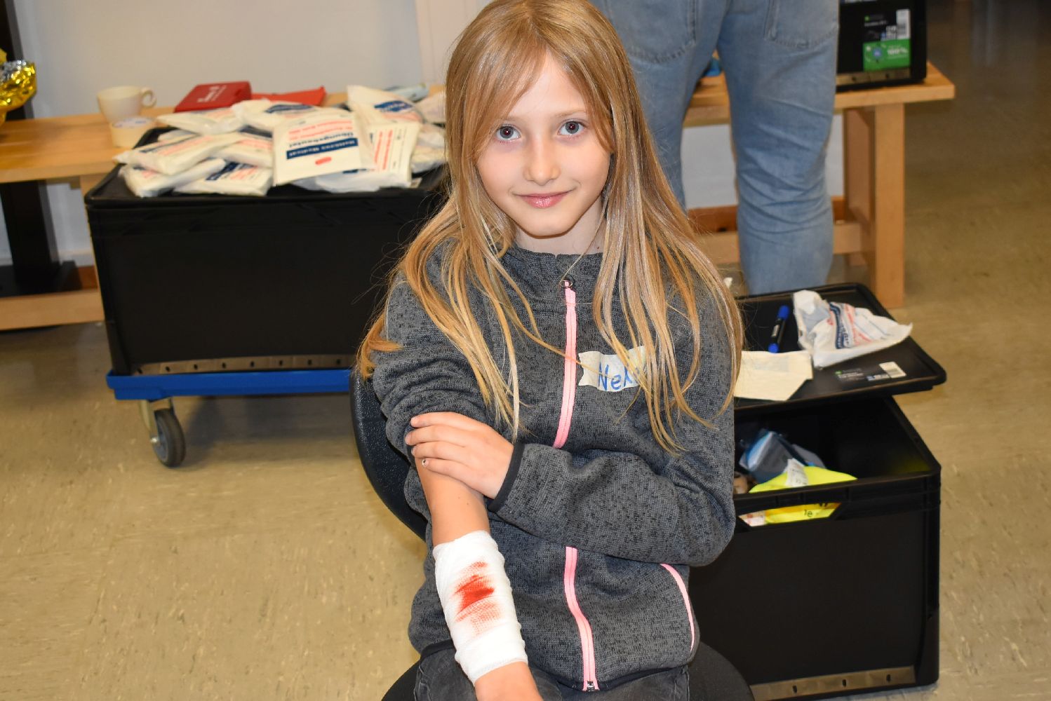 Dank der Unterstützung der Johanniter wurden die Kinder unserer Schulgemeinschaft klassenweise an die Erste Hilfe bei Verletzungen spielerisch herangeführt. Während des Kurses lernten die Kinder, wie sie über 112 einen Notruf absetzen, wie die stabile Seitenlage funktioniert, wie man einen Verletzten sicher transportiert und wie man Verbände anlegt. Ritualisierte Handlungen vermittelten den Kindern anschaulich die Schritte in der Ersten Hilfe. Der Reihe nach versuchten sich die Kinder als Ersthelfer oder schlüpften in die Rolle eines Verletzten. Durch die Wiederholung gewannen die Kinder schnell an Sicherheit. Dadurch können Berührungsängste frühzeitig abgebaut werden. Nicht zu unterschätzen ist dabei auch die Förderung der sozialen Kompetenzen, denn beim praktischen Tun musste sich jeder auf den anderen verlassen können.