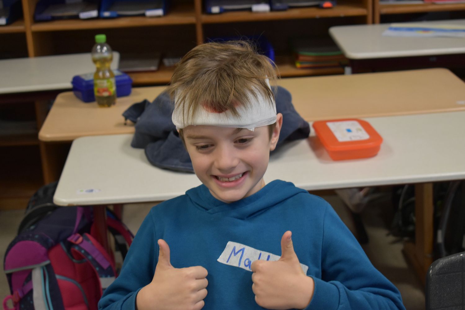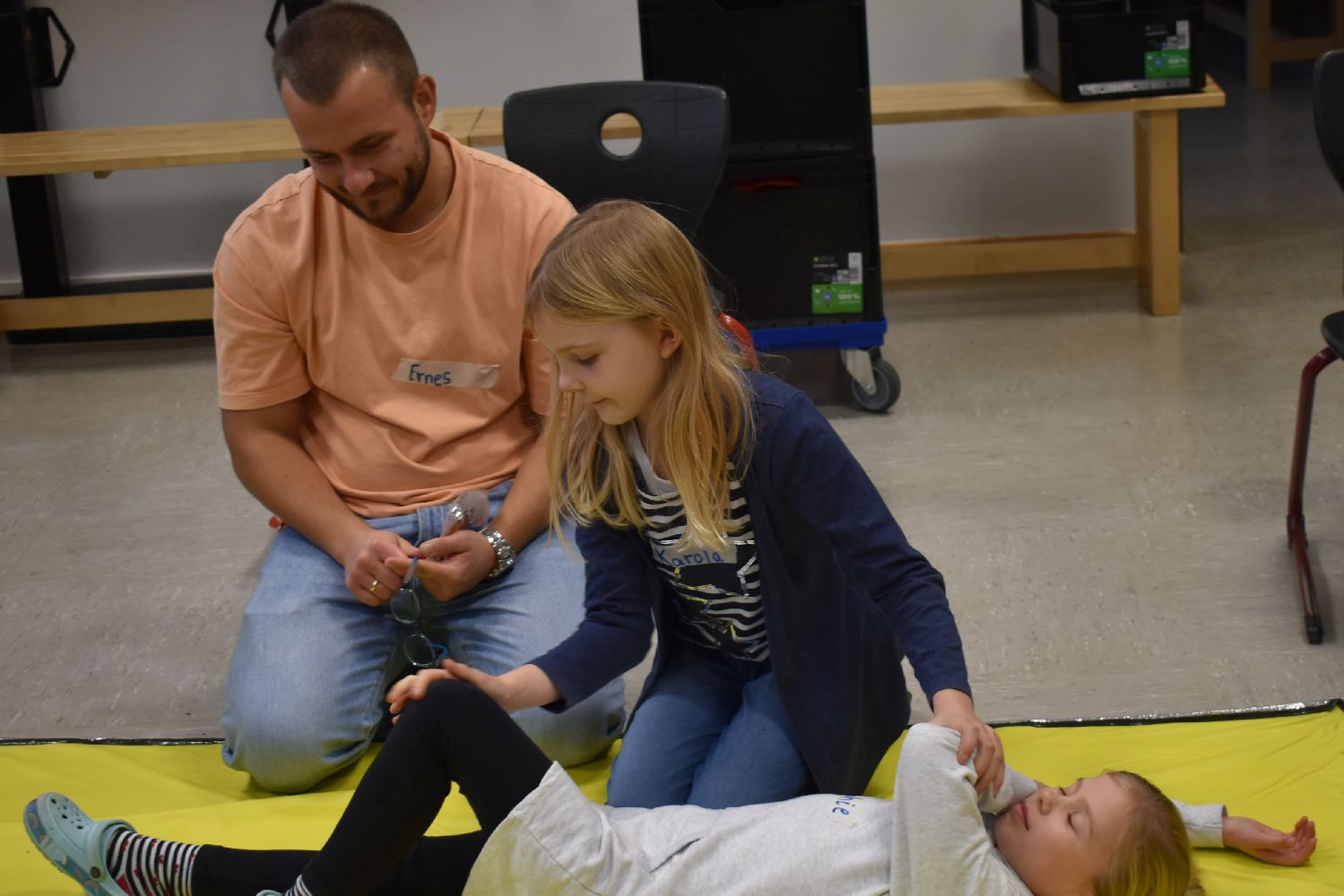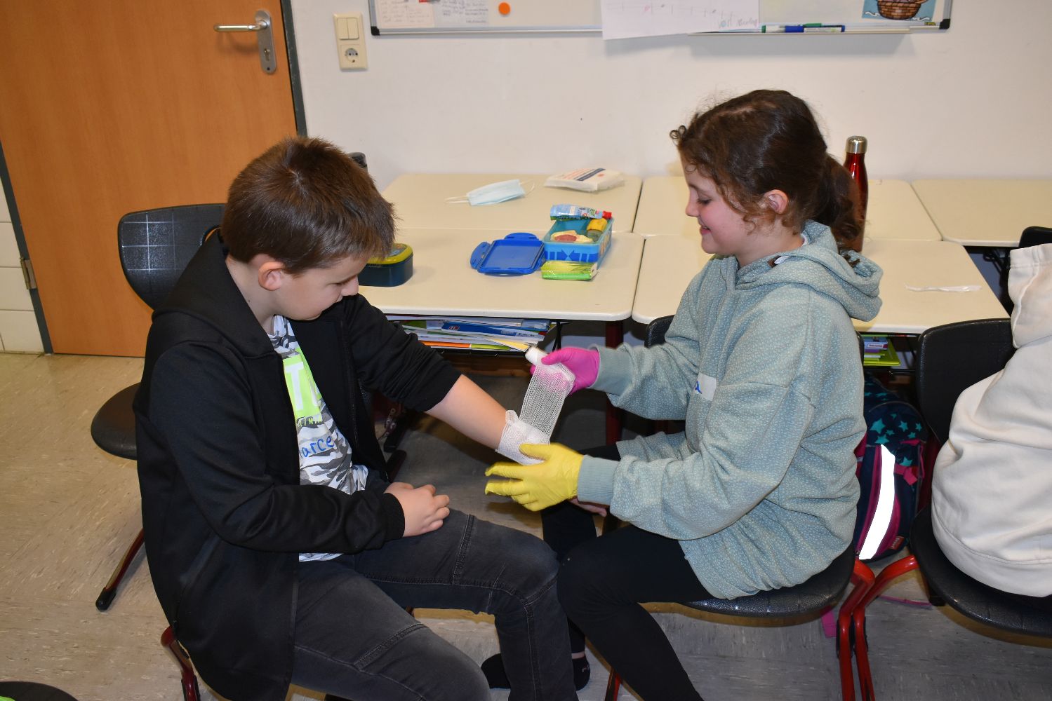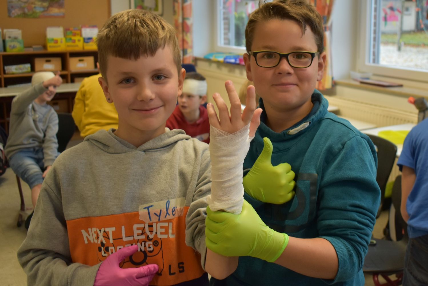 Dank der Unterstützung der Johanniter wurden die Kinder unserer Schulgemeinschaft klassenweise an die Erste Hilfe bei Verletzungen spielerisch herangeführt. Während des Kurses lernten die Kinder, wie sie über 112 einen Notruf absetzen, wie die stabile Seitenlage funktioniert, wie man einen Verletzten sicher transportiert und wie man Verbände anlegt. Ritualisierte Handlungen vermittelten den Kindern anschaulich die Schritte in der Ersten Hilfe. Der Reihe nach versuchten sich die Kinder als Ersthelfer oder schlüpften in die Rolle eines Verletzten. Durch die Wiederholung gewannen die Kinder schnell an Sicherheit. Dadurch können Berührungsängste frühzeitig abgebaut werden. Nicht zu unterschätzen ist dabei auch die Förderung der sozialen Kompetenzen, denn beim praktischen Tun musste sich jeder auf den anderen verlassen können.