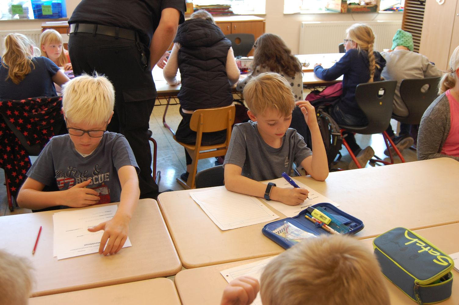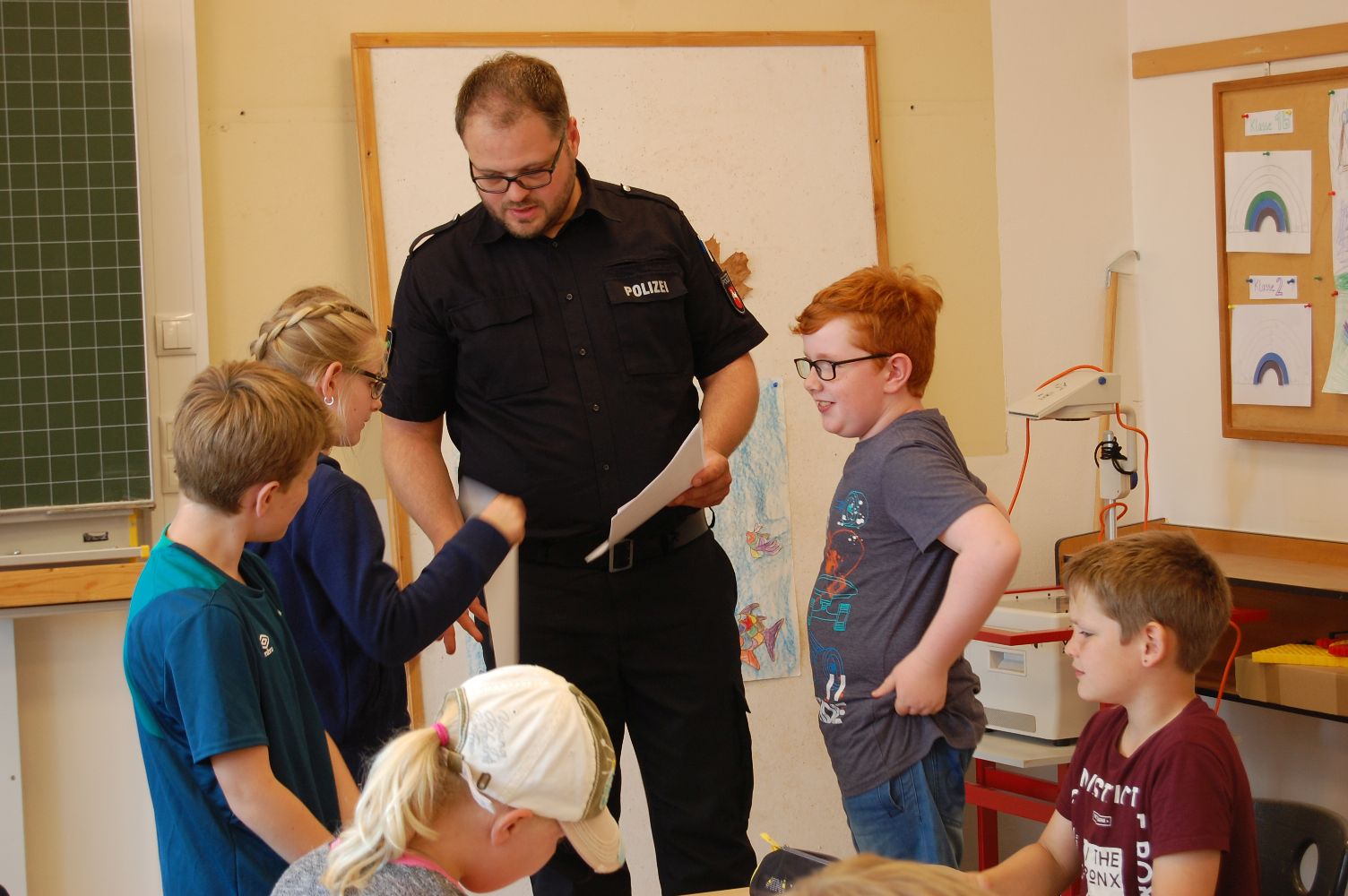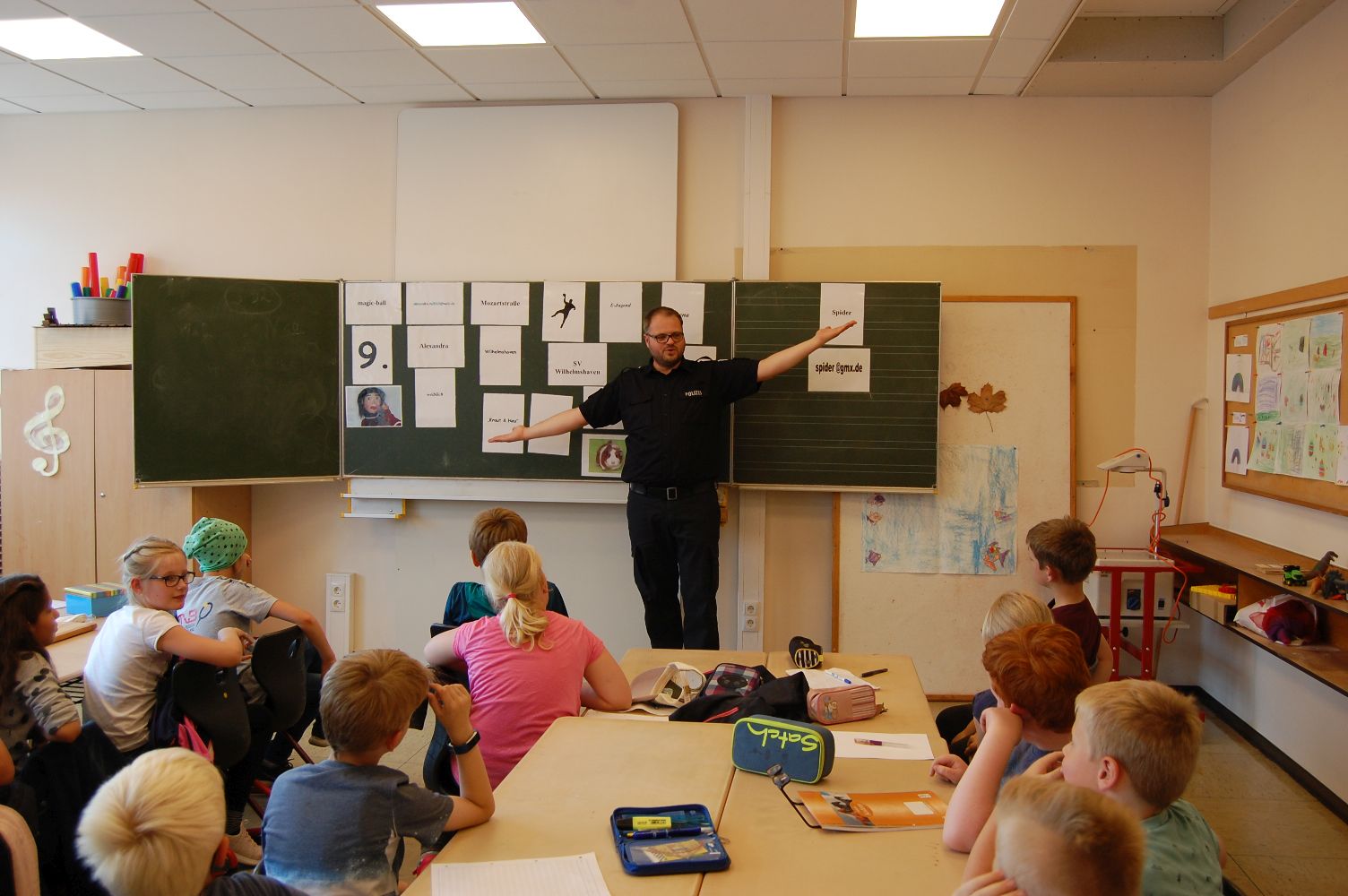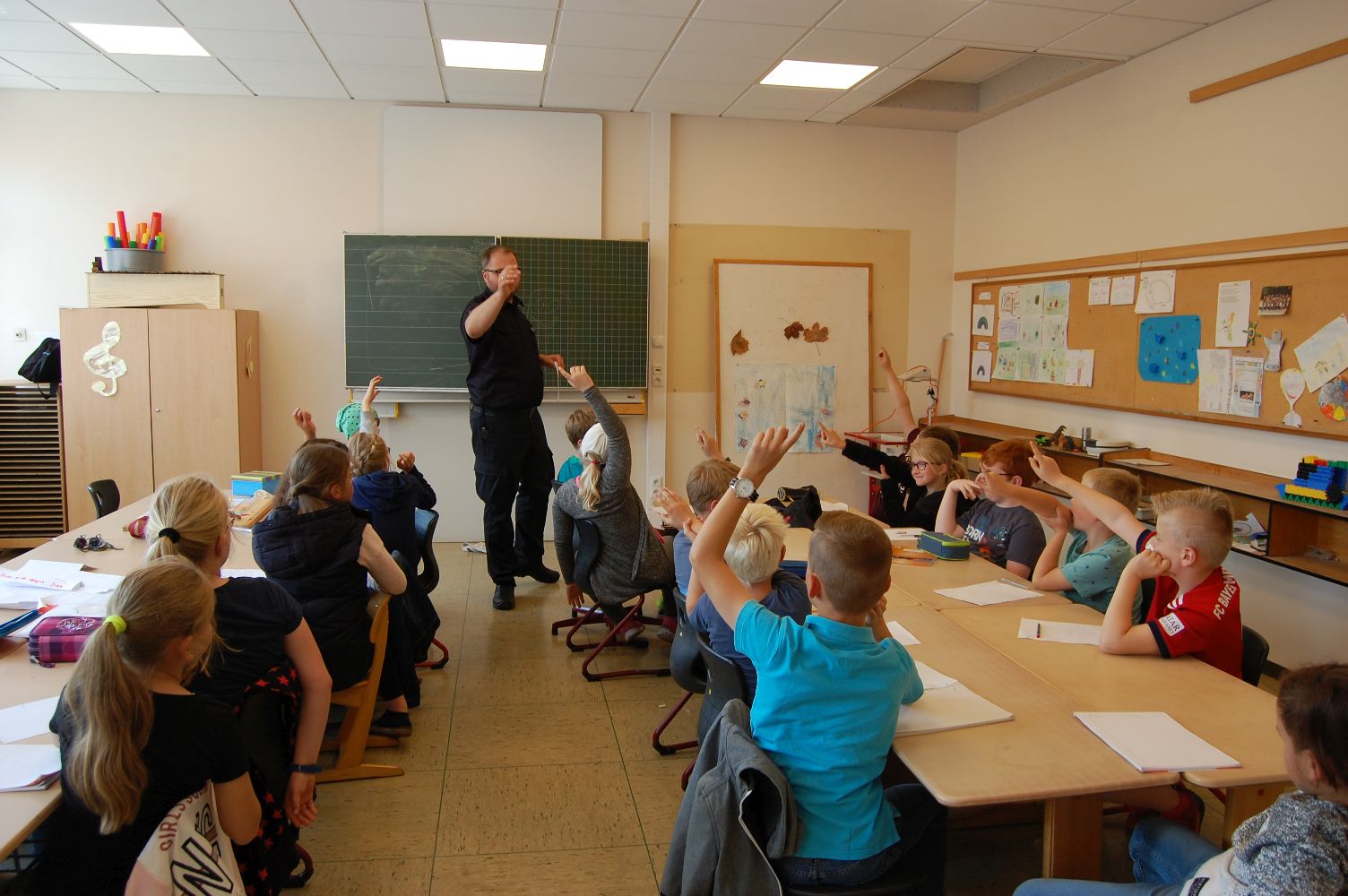 Die anschließende Nachbereitung des Stücks fand im Klassenverband statt. Eine Befragung der Kinder zu ihrem Internetkonsum ergab sowohl für Lehrer als auch für Eltern wichtige Erkenntnisse, welche die darauf folgenden Ratschläge für einen sicheren Umgang mit dem Internet umso dringlicher machten. So sprachen die beiden Mitglieder der besagten Puppenbühne die Benutzung eines Nicknamens zum Schutze der eigenen Identität und eine sichere E-Mail-Adresse an, die keinerlei persönliche Daten enthalten sollte. Die Kinder erfuhren aber auch, dass ein sicheres Passwort aus Groß- und Kleinbuchstaben, Zahlen, Sonder- und Satzzeichen besteht und dass man es sich leicht mit einem kleinen Satz merken könne. Von eigenen Fotos als Profilbilder im Netz wurde abgeraten. Zum Abschluss bekamen die Kinder den Tipp, sich im Internet so zu verhalten, wie man sich einem Fremden draußen gegenüber verhalten würde. Persönliches geht auch ihn nichts an! Auch spielerisch versuchten die Polizeibeamten den Kindern deutlich vor Augen zu führen, dass sie, wenn sie ins Internet gehen, sich nicht mehr in ihrem geschützten Zimmer befinden, sondern im world wide web, also sozusagen in der „weiten Welt“. Mit der Vergabe geeigneter Suchmaschinen für Kinder im Internet endete die Medienprävention für unsere Dritt- und Viertklässler.