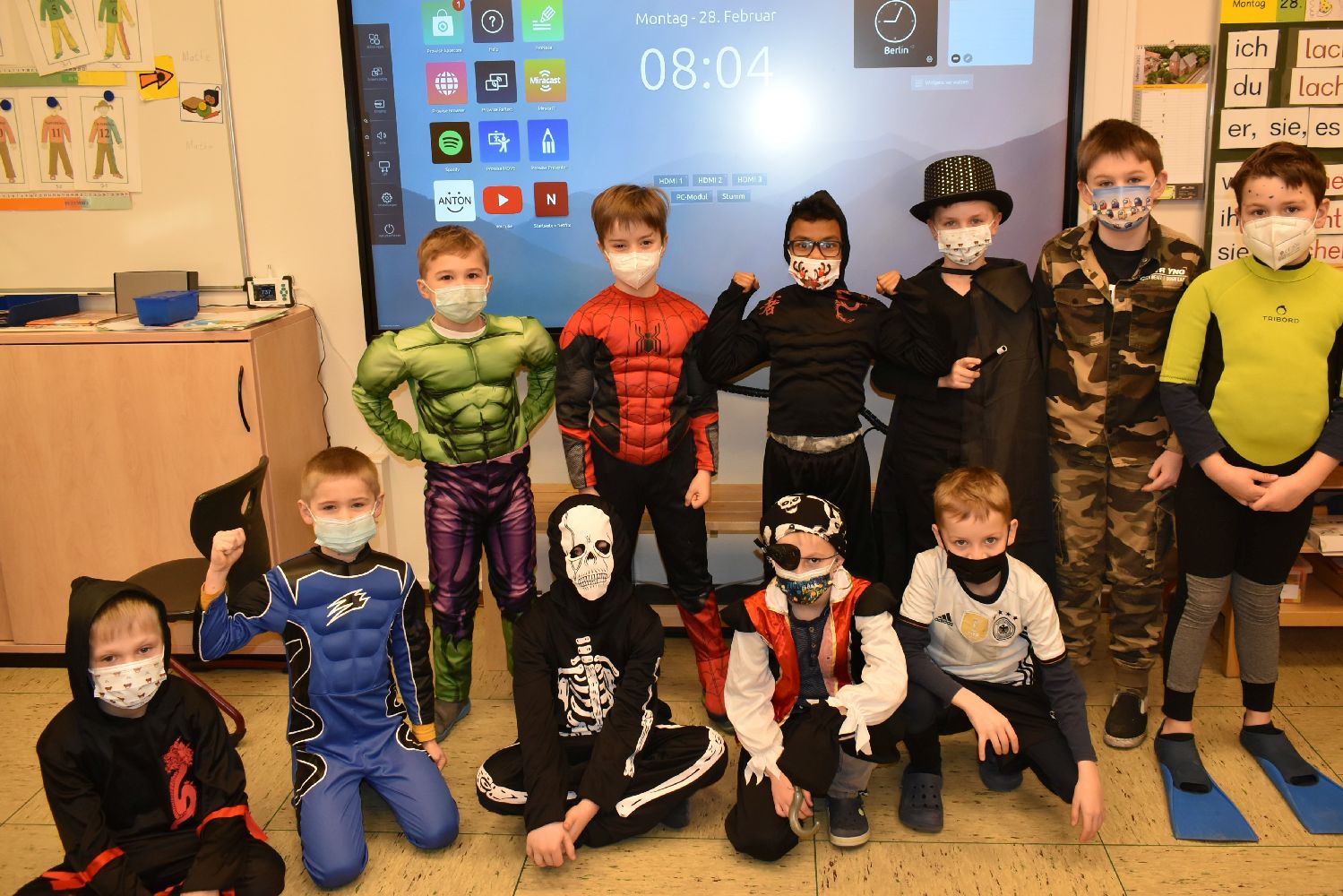 Natürlich konnte der Karneval aufgrund der derzeitigen Coronalage noch nicht in einem größeren Rahmen stattfinden. Aber die Kinder hatten sich trotzdem schon lange auf den Rosenmontag gefreut, denn im kleinen Kreis der Klassengemeinschaft standen an diesem Schulvormittag viele kreative und spielerische Aktivitäten auf dem Programm. Wer wollte durfte verkleidet in die Schule kommen und viele Kinder machten davon Gebrauch. Dank der digitalen Tafeln konnte sogar etwas Kinoatmosphäre in die Klassenräume einziehen und der Duft von Popcorn und anderen Knabbereien erfüllte schon bald die Luft. Und wer hätte vor einem Jahr gedacht, dass auch in diesem Karneval die Maske und das regelmäßige Lüften noch dazugehören würden.