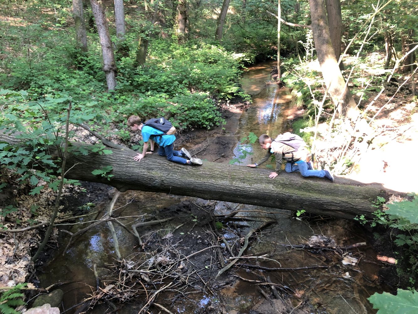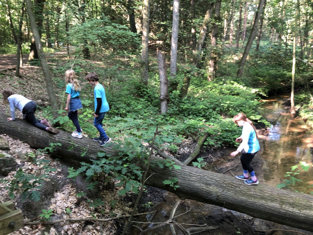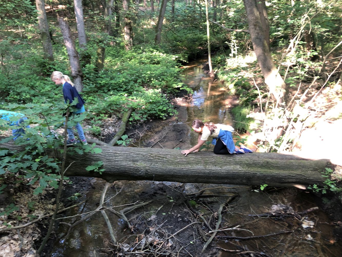 Zunächst starteten wir mit einer kleinen Wanderung durch den Wald, auf der es bereits einiges zu entdecken und bestaunen gab, z.B. kleine Kröten, die in großer Anzahl über den Waldweg hüpften. Außerdem führte uns die Waldpädagogin Carola Freise zu den Teichen, an denen jeder seine Weitwerfkünste unter Beweis stellen konnte. Auch eine Aussichtsplattform konnte bestiegen werden. Ganz Wagemutige konnten anstelle der sicheren Brücke, die Ausläufer der Lethe auch über einen Baumstamm überqueren.