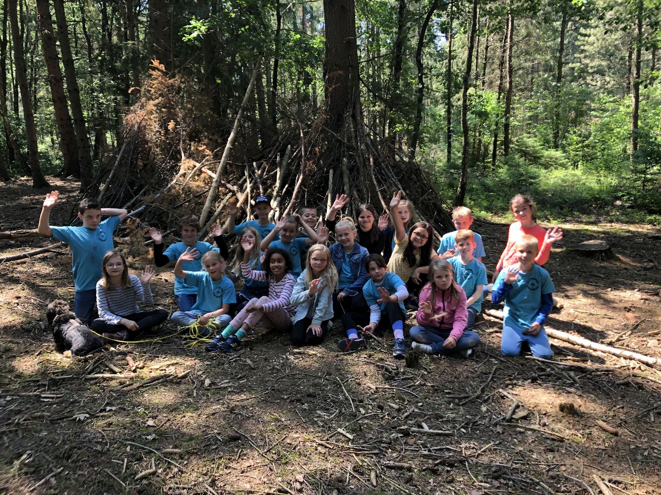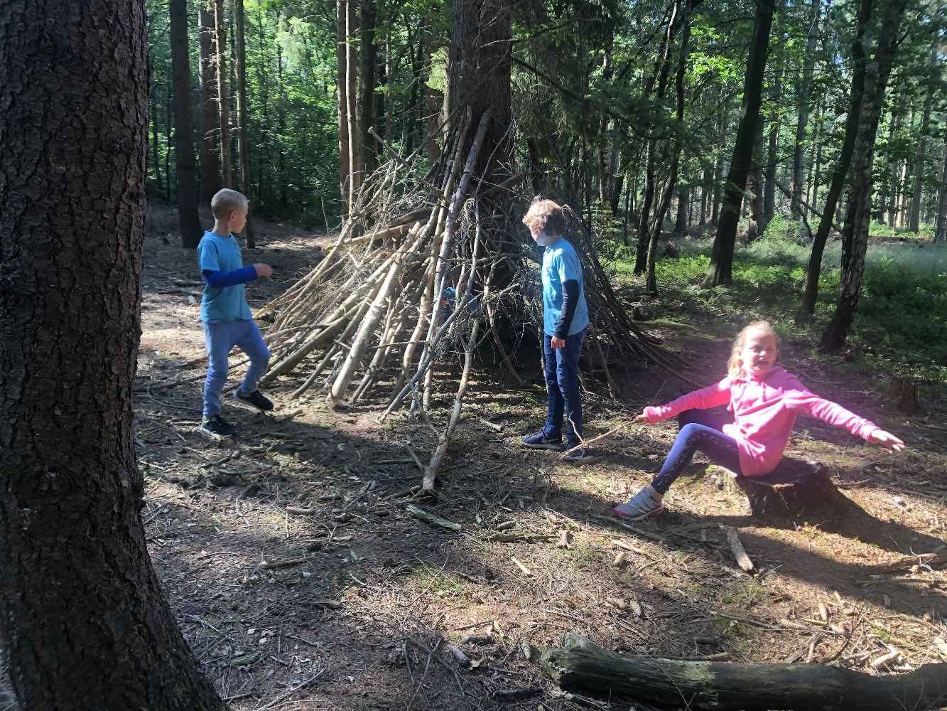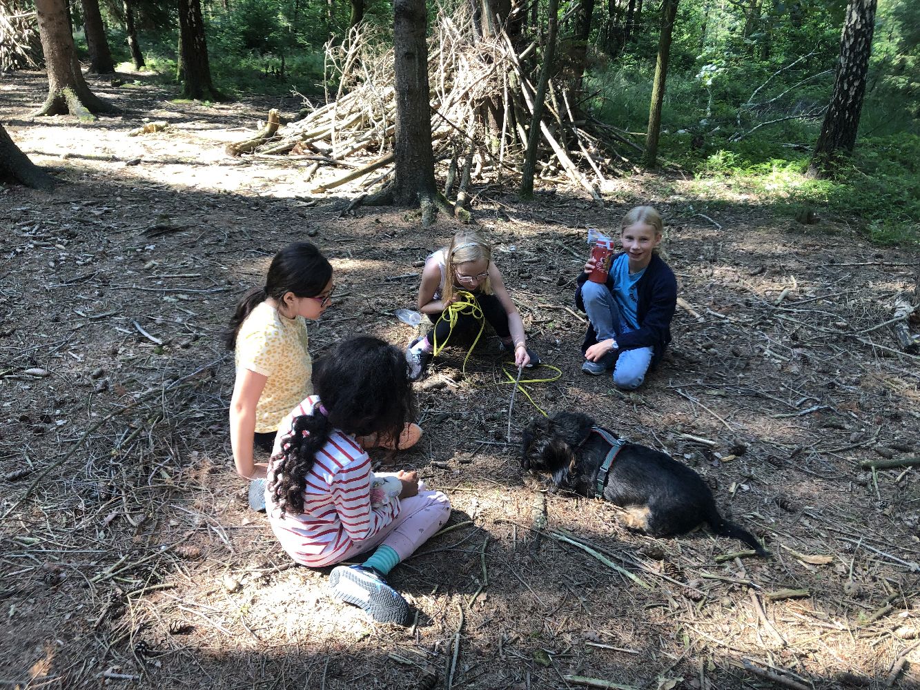 Nach einem ausgiebigen Frühstück in großer Runde, hatten die Schülerinnen und Schüler Zeit, sich frei in dem Waldstück auszutoben. Ganz hoch im Kurs stand dabei der Bau eines Tippis. Herumliegende Äste von Bäumen und Sträuchern wurden dafür herangeschleppt und aufgeschichtet, bis eine stattliche Behausung entstanden war. Mittendrin immer Asterix, der Rauhaardackel der Waldpädagogin.