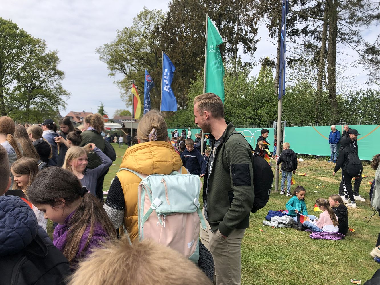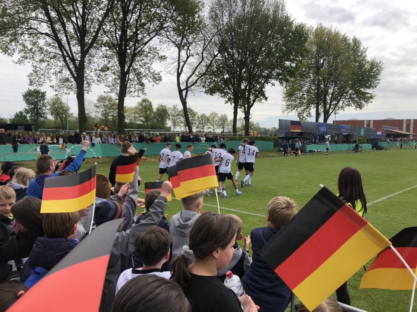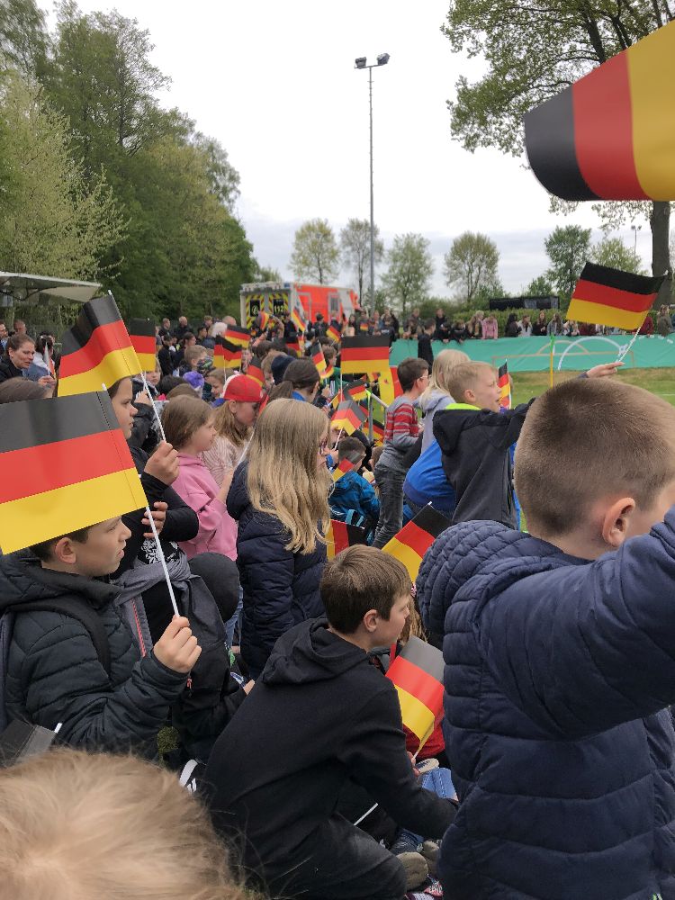 Das Spiel begann sofort temporeich und die deutsche Mannschaft erarbeitete sich einige Torchancen, die aber zunächst nicht umgesetzt werden konnten. Auch ein zugesprochener Foulelfmeter konnte nicht verwandelt werden. Doch die Kinder ließen nicht nach, die Mannschaften anzufeuern. Zur Unterstützung hatte jedes Kind zu Beginn des Spiels noch eine Deutschlandfahne bekommen. So blieb es dennoch beim 0:0 zur Halbzeitpause.