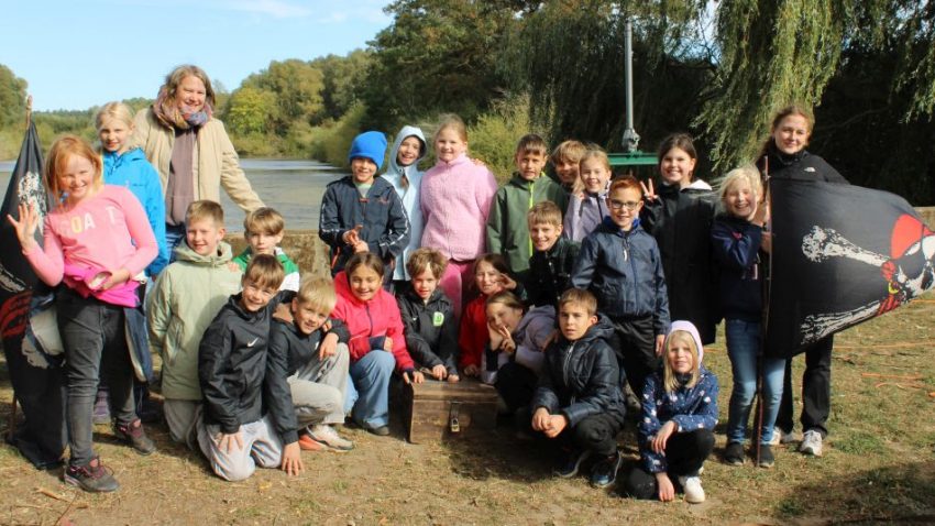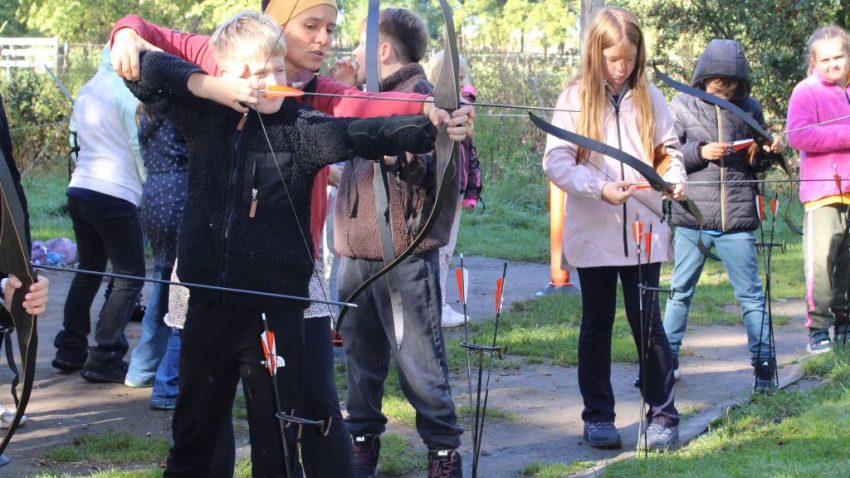 Die Klassen 4a und 4b blieben dem Reitgelände des Schlosses meist fern, da sie sich im Vorfeld für das Abenteuerprojekt entschieden haben. Beim Bogenschießen auf Strohscheiben und Luftballons zeigten sie ihre Zielgenauigkeit, die mit jedem Pfeil etwas besser wurde, sodass man im Laufe des Projekts immer häufiger einen Ballon knallen hörte. Jeder Treffer wurde mit einem kräftigen Applaus und Jubel durch die Mitschülerinnen und Mitschüler honoriert. Auch wenn der Spaß im Vordergrund stand, war im Umgang mit der „Waffe“ eine Eigenschaft der Kinder besonders wichtig: Verantwortung. Der Umgang mit Pfeil und Bogen war an klare Regeln gebunden, die von den Kindern die Verantwortung für Menschen um sie herum, für sich selbst und für das Material verlangte.