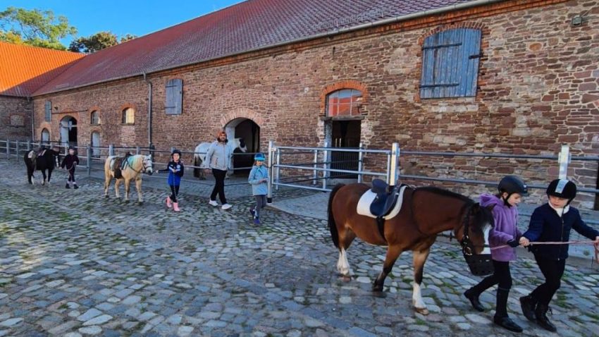 Die Kinder der 4b haben sich für das Reitprojekt entschieden. Die Kinder wurden paarweise einem zu ihnen passendem Pferd oder Pony zugewiesen, um das sie sich in dieser Woche kümmern mussten. Das bedeute nicht nur jeden Tag auf dem Rücken der Pferde reiten zu dürfen, sondern auch sich um die Tiere zu kümmern. Das Fell musste gestriegelt und die Mähne gebürstet werden. Zunächst begegneten einige Kindern den Tieren noch mit etwas Angst. Diese löste sich jedoch zunehmend auf und wandelte sich Stück für Stück in Respekt und Zutrauen. Am letzten Tag des Projekts unternahm die Reitgruppe einen Ausritt, der sie einmal um und durch den Park der Jugendherberge führte.