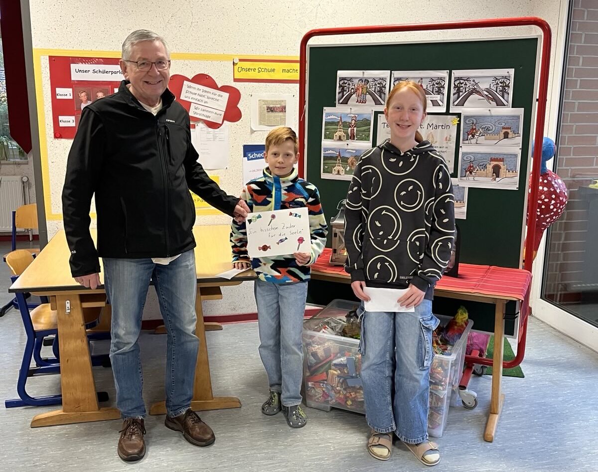 Stellvertretend für die Schule überreichten unsere Schülersprecher*innen Valentin und Ella aus Klasse 4 die gesammelten Süßigkeiten an den Koordinator der Tafel, Herrn Diakon Klasen, der die Spende dankend in Empfang nahm.