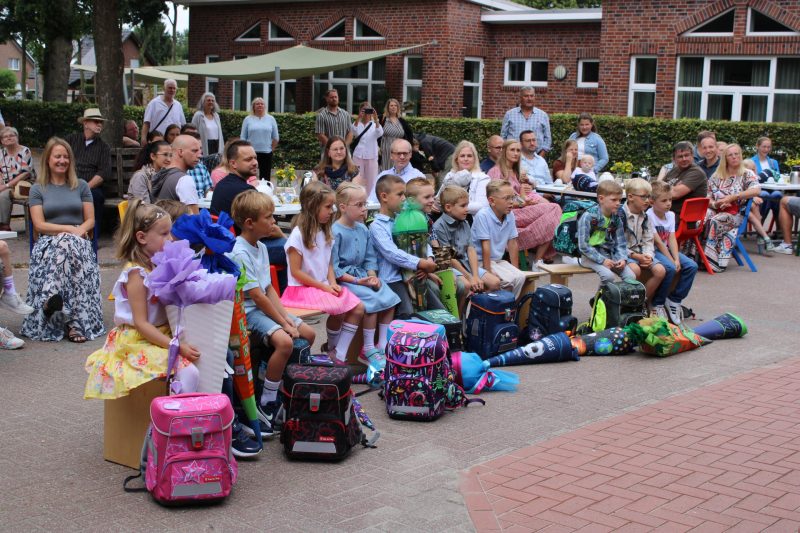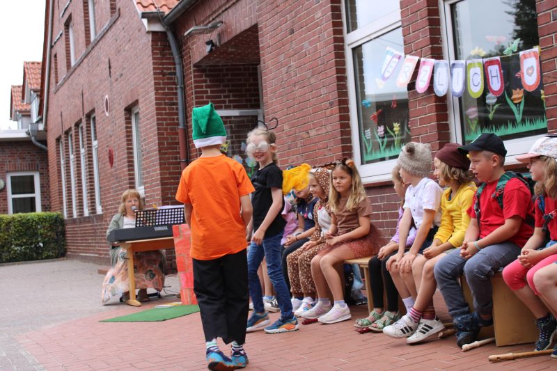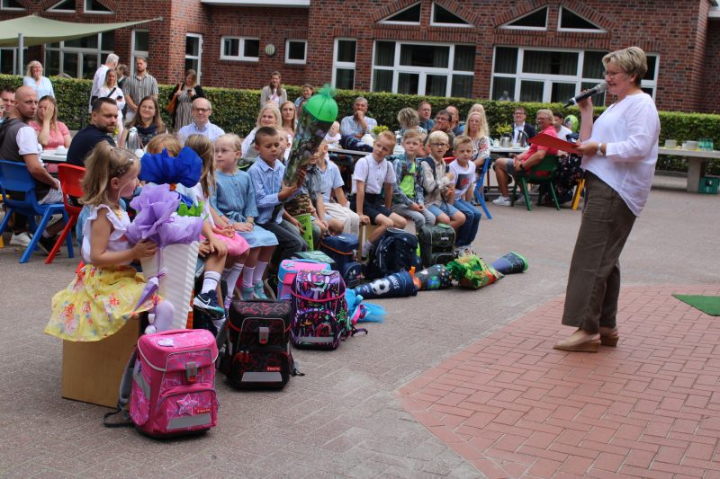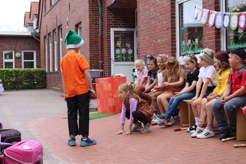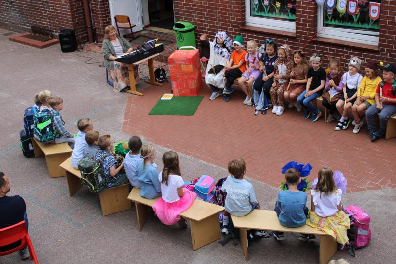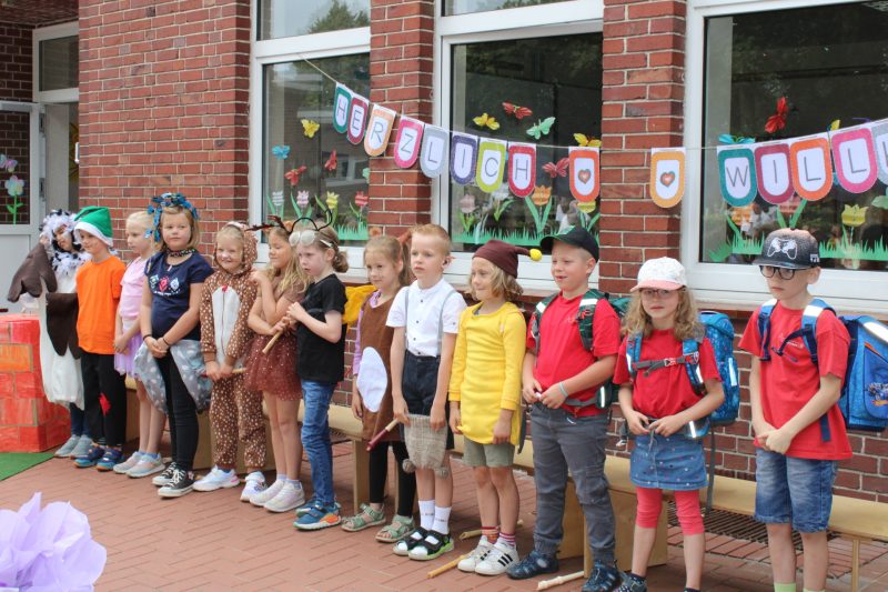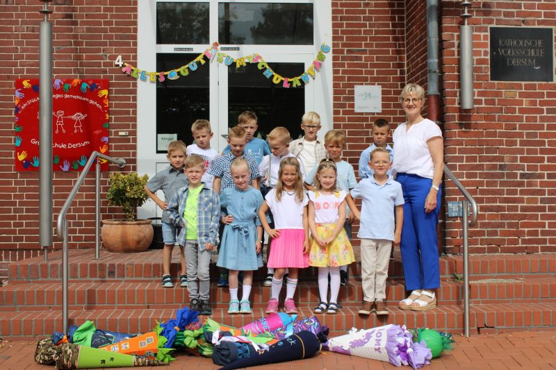 Am Samstag wurden dreizehn ABC-Schützen in unserer Schule begrüßt. In einem feierlichen Gottesdienst unter der Leitung von Gemeindereferentin Marina Nee wurden die Kinder gesegnet. Anschließend hieß Frau Kuper-Eiken die neuen ErstklässlerIinnen und ihre Familien auf dem Schulhof herzlich willkommen. In phantasievollen Kostümen führten die Kinder des zweiten Schuljahres das Theaterstück “Nis Puck möchte lesen lernen” auf und begrüßte die “Neuen” mit Flötenspiel und Gesang. Danach gingen die Kinder der neuen Klasse 1 mit ihrer Klassenlehrerin Frau Herbers zur ersten Schulstunde in ihren Klassenraum.