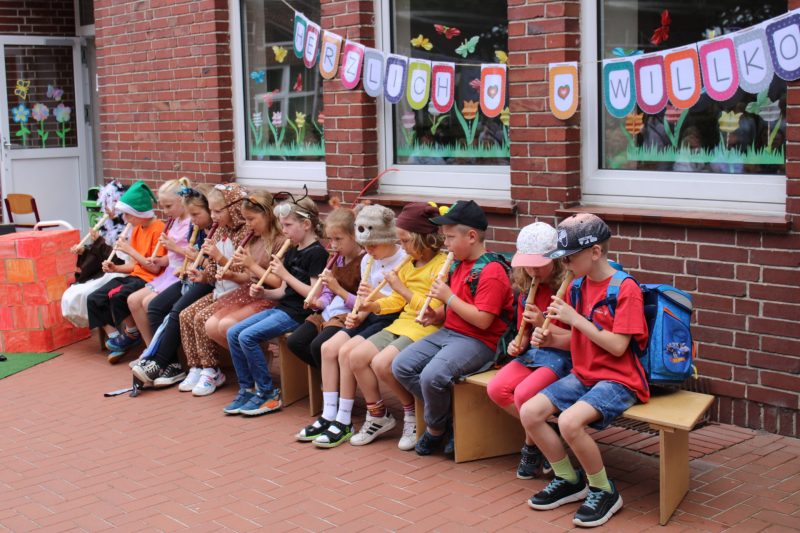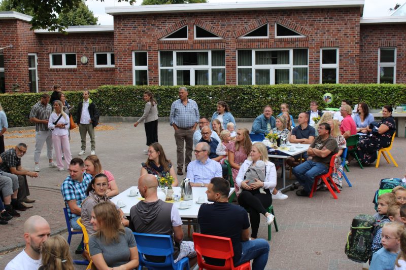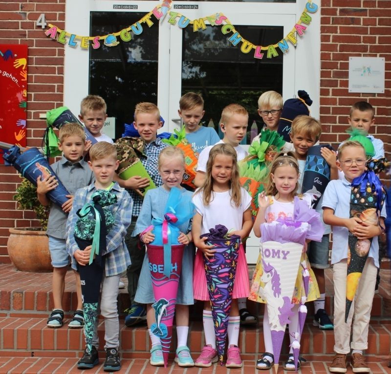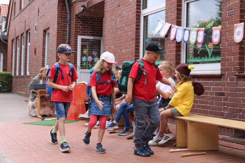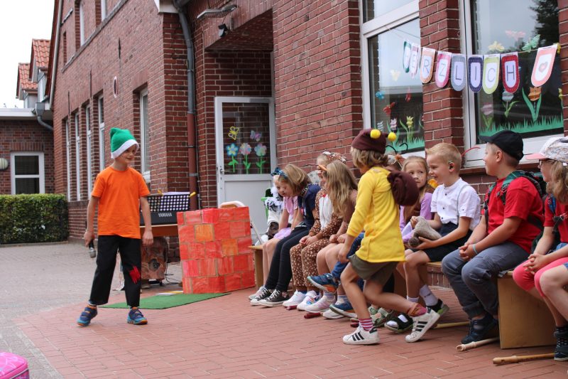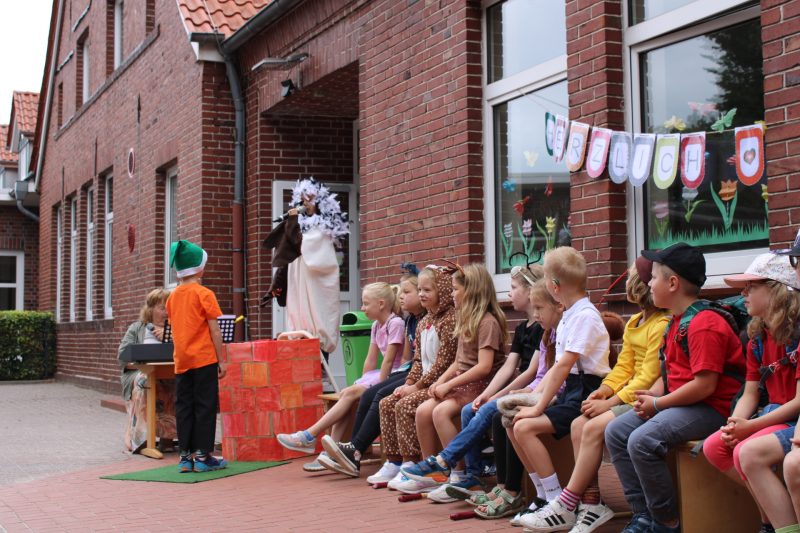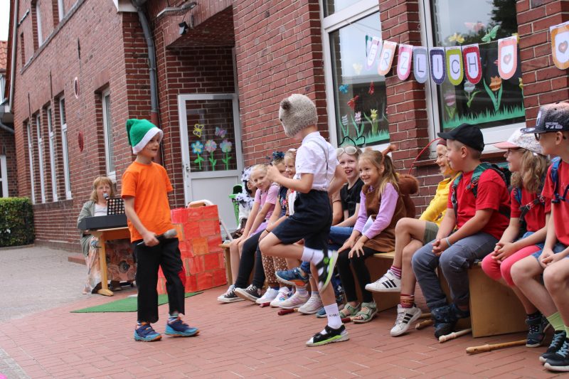 Am Samstag wurden dreizehn ABC-Schützen in unserer Schule begrüßt. In einem feierlichen Gottesdienst unter der Leitung von Gemeindereferentin Marina Nee wurden die Kinder gesegnet. Anschließend hieß Frau Kuper-Eiken die neuen ErstklässlerIinnen und ihre Familien auf dem Schulhof herzlich willkommen. In phantasievollen Kostümen führten die Kinder des zweiten Schuljahres das Theaterstück “Nis Puck möchte lesen lernen” auf und begrüßte die “Neuen” mit Flötenspiel und Gesang. Danach gingen die Kinder der neuen Klasse 1 mit ihrer Klassenlehrerin Frau Herbers zur ersten Schulstunde in ihren Klassenraum.