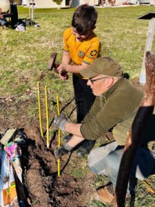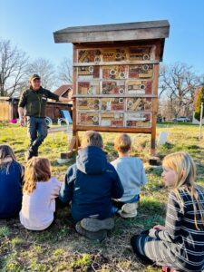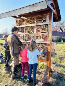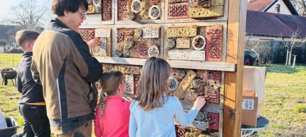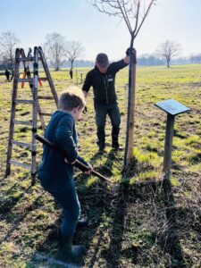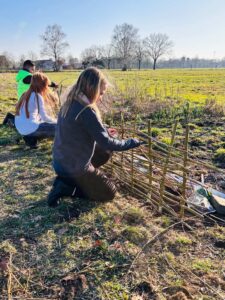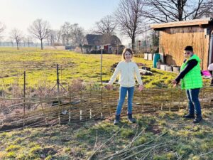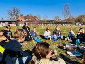 Am Donnerstag, den 5. März, machten sich 16 Ganztagskinder der zweiten und vierten Klassen der Grundschule Diepenau bei strahlendem Frühlingswetter wieder einmal auf den etwa zwanzigminütigen Fußweg zu „ihrer“ Streuobstwiese. Die Fläche der Familie Beckmann wurde vor einigen Jahren gemeinsam mit der Biologischen Station Minden-Lübbecke angelegt und wird seitdem regelmäßig von den Kindern gepflegt. Unter Anleitung von Sascha Traue arbeiteten die Schülerinnen und Schüler diesmal an drei Stationen: Das Insektenhotel wurde mit frischen Materialien ausgestattet und mit Lehm repariert, nachdem ein hungriger Specht einige Löcher hinterlassen hatte. Außerdem harkten die Kinder Maulwurfshügel glatt und befreiten die Baumscheiben rund um die jungen Obstbäume von Unkraut, damit Regenwasser besser in den Boden gelangen kann. An einer dritten Station entstand aus Weidenruten ein neuer Zaun für ein Gemüsebeet. Unterstützt wurden die Gruppen auch von zwei Bundesfreiwilligendienstlern der Biologischen Station. Eine wohlverdiente Pause durfte natürlich nicht fehlen: Franka Beckmann und ihre Familie versorgten alle mit reichlich Butter- und Apfelkuchen. Während die ViertklässlerInnen schon zunehmend routiniert an die Arbeit gingen, war für viele ZweitklässlerInnen vieles neu und besonders spannend. Neben der praktischen Arbeit erklärte Sascha Traue den Kindern auch viel über das Leben auf einer Streuobstwiese und warum solche Orte für Tiere, Pflanzen und Menschen so wertvoll sind. Ein sonniger Nachmittag, viel Einsatz und eine Menge neue Erfahrungen – ein weiterer schöner Baustein in der Zusammenarbeit der Grundschule Diepenau mit der Biologischen Station Minden-Lübbecke.