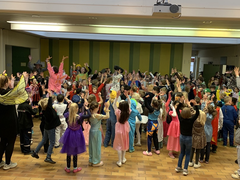 Am vergangenen Rosenmontag feierte die Schulgemeinschaft Karneval. In vielen Klassen wurde gefrühstückt. Außerdem konnten die Schüler*innen Spiele und ein bisschen Knabberkram mitbringen. Nach der großen Pause machte sich die 2a auf den Weg, um mit einer langen Polonäse alle übrigen Klassen „einzusammeln“ und zur Aula zu führen. Dort gab es dann eine kleine Karnevalsdisco, bei der getanzt und laut gesungen wurde. Bohmte helau!