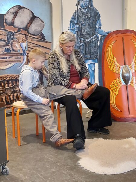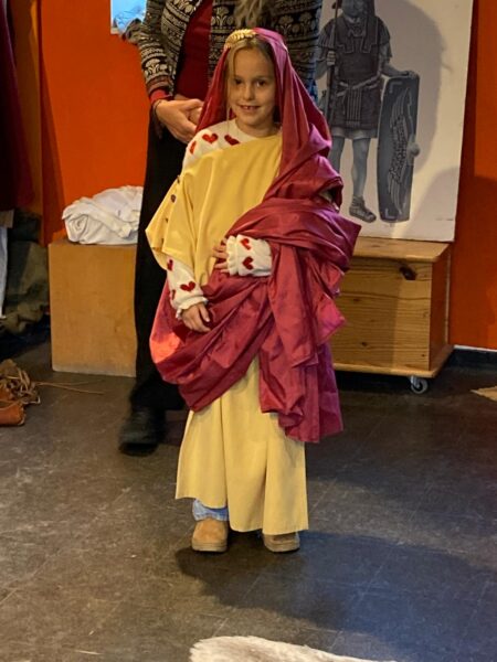 Dabei wurden Modelle von Wohnhäusern betrachtet und jedes Kind durfte einmal einen römischen Helm aufsetzen. Besonders anschaulich wurde der geschichtliche Hintergrund durch die Erzählung zweier Germanenkinder, die sich mit einem römischen Mädchen anfreunden und jeweils deren andere Kultur kennen lernen.