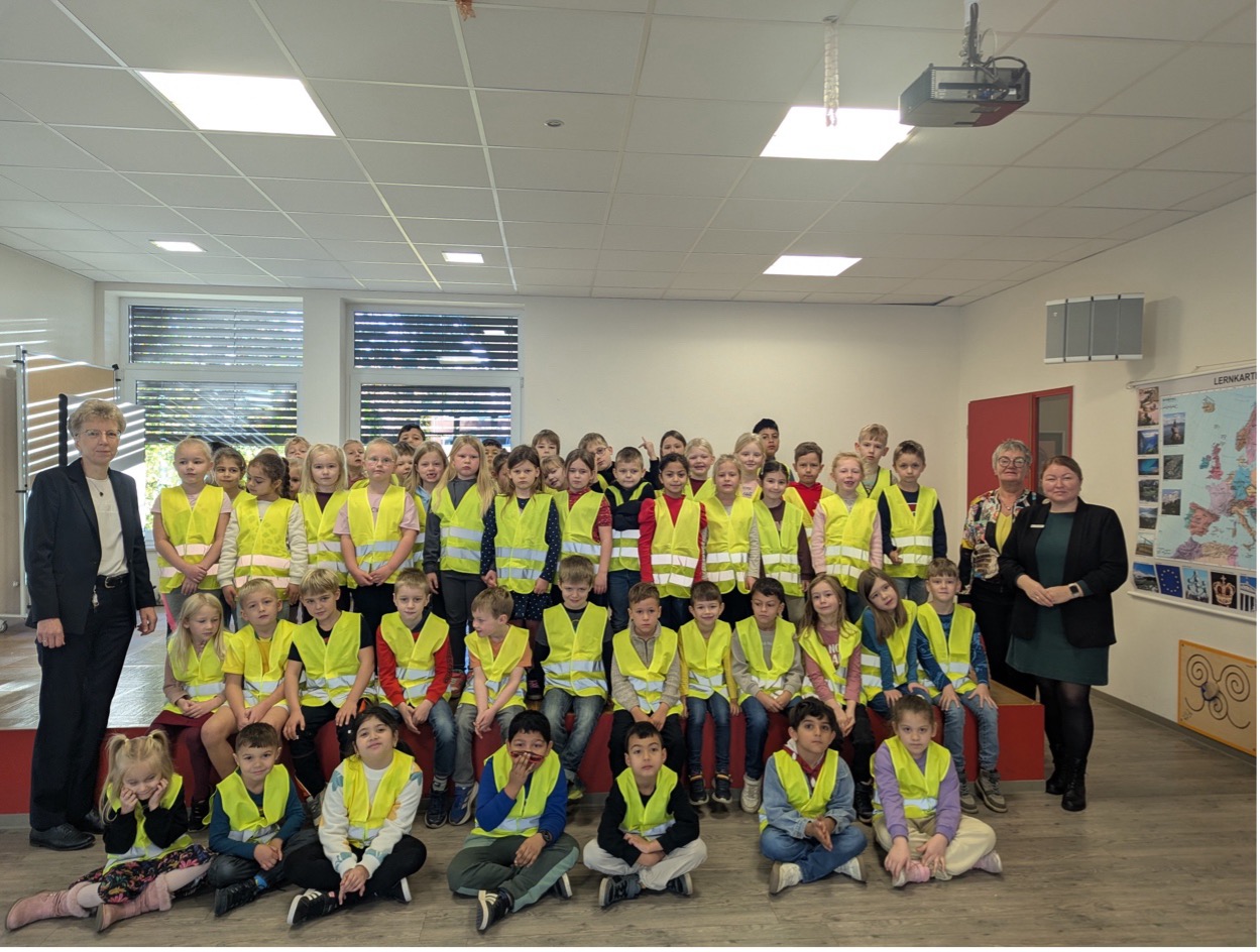 Damit die Schülerinnen und Schüler der Grundschule Esterwegen in der dunklen Jahreszeit schon frühzeitig von den anderen Verkehrsteilnehmern gesehen werden, erhielten sie von der Volksbank Nordhümmling eG leuchtende Warnwesten.