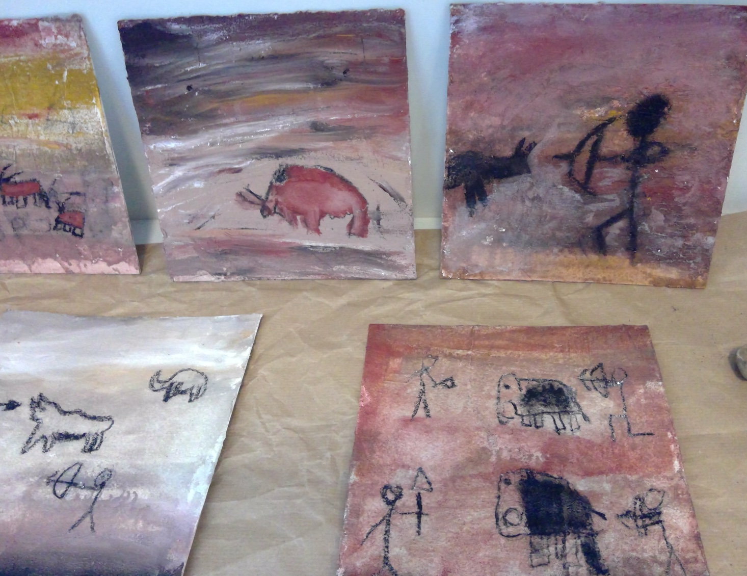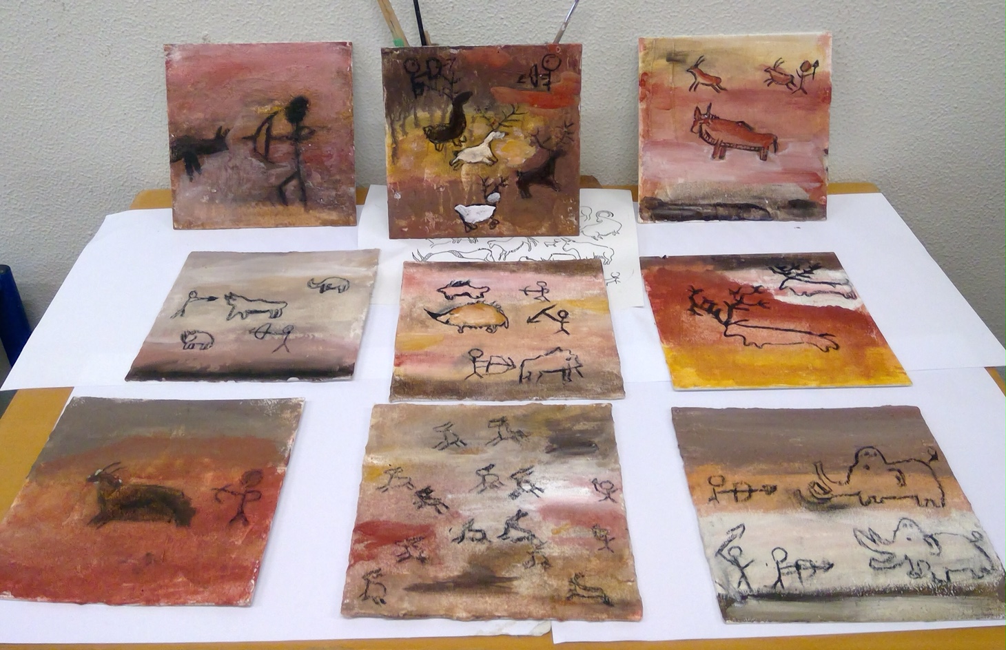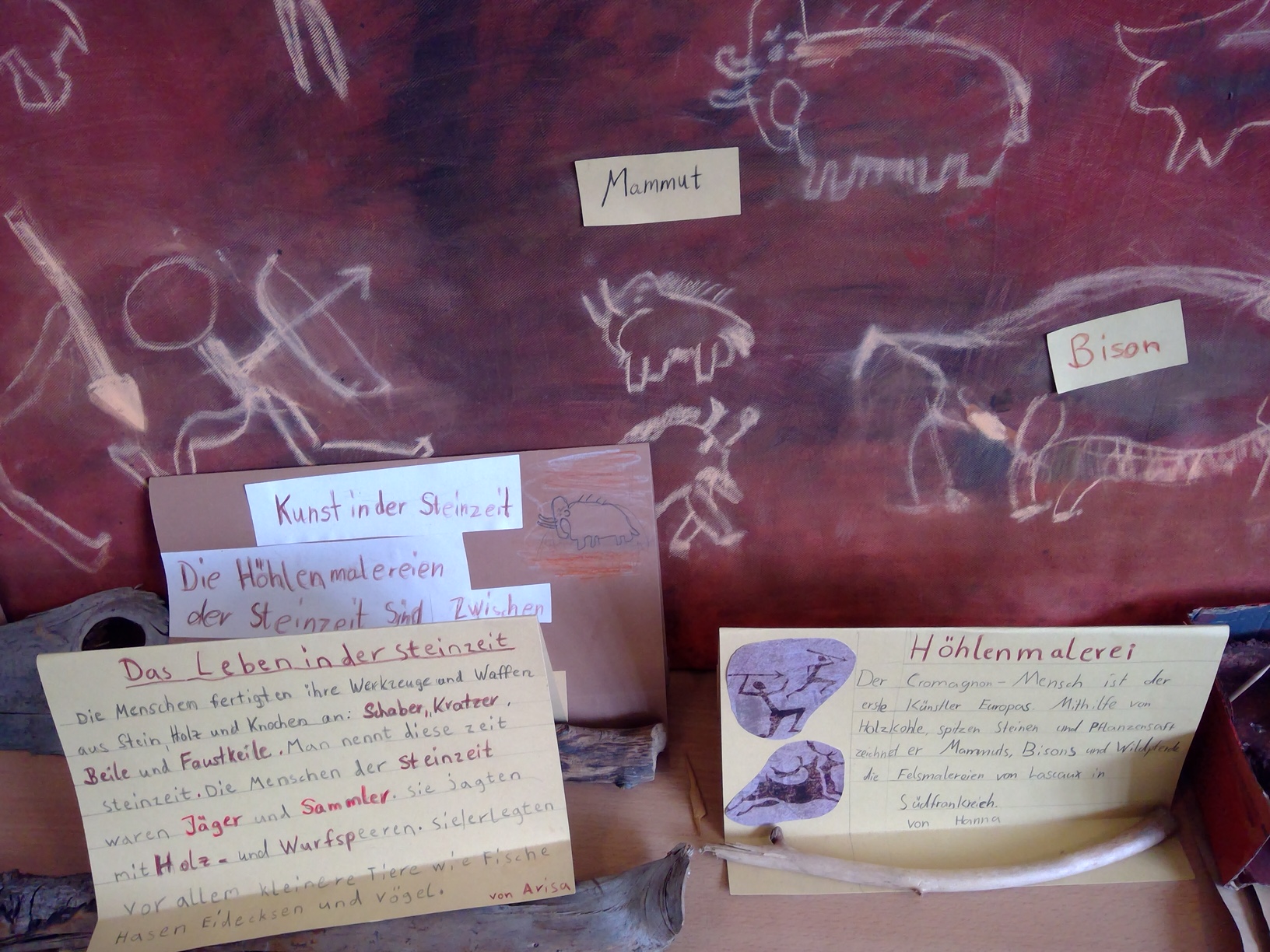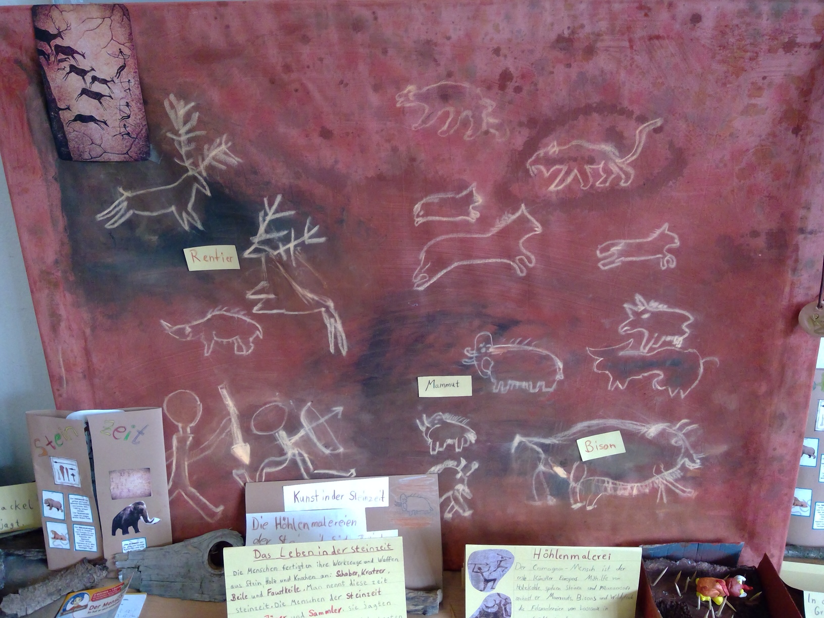 Die Schüler*innen konnten zu selbstgewählten Themenbereichen (Wohnen ,Tiere und Jagd, Höhlenmalerei, …) in Partner- oder Gruppenarbeit ihre Ideen gestalterisch umsetzen.