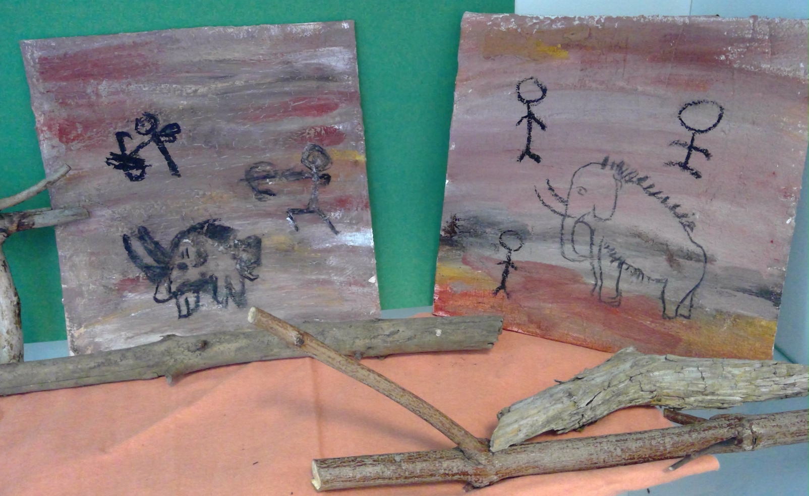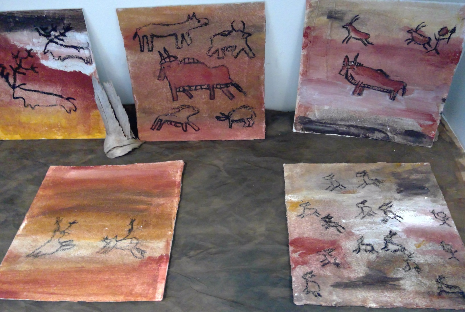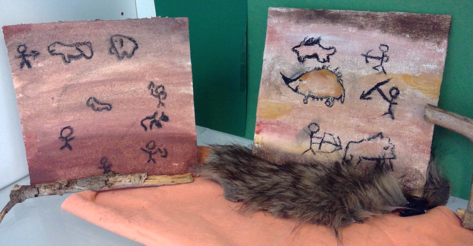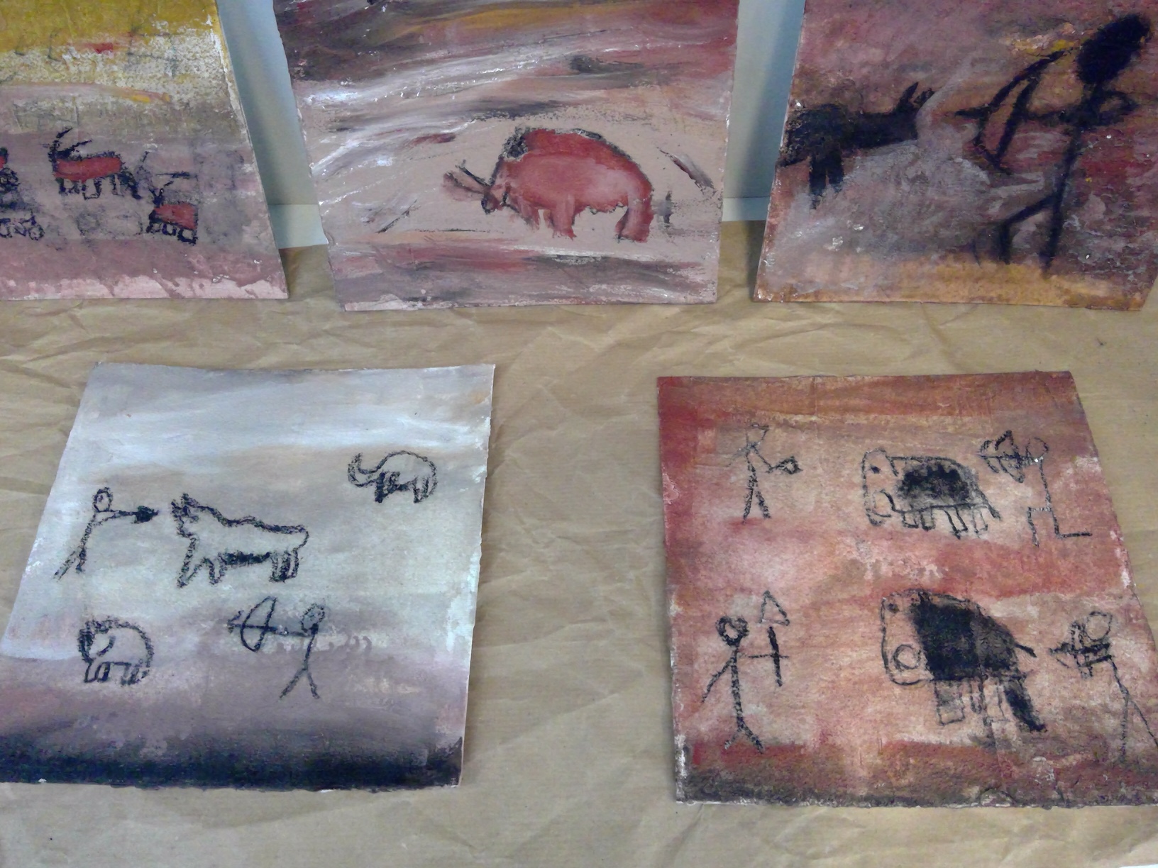 Die Schüler*innen konnten zu selbstgewählten Themenbereichen (Wohnen ,Tiere und Jagd, Höhlenmalerei, …) in Partner- oder Gruppenarbeit ihre Ideen gestalterisch umsetzen.