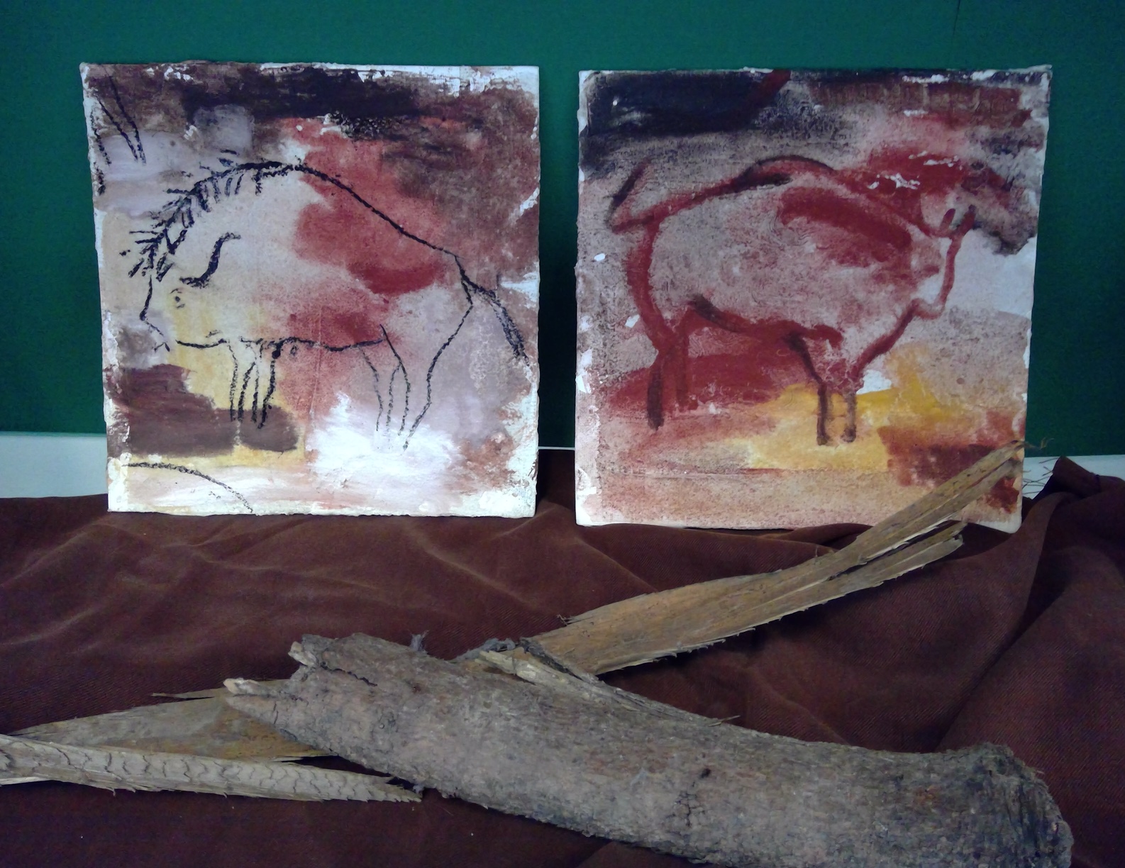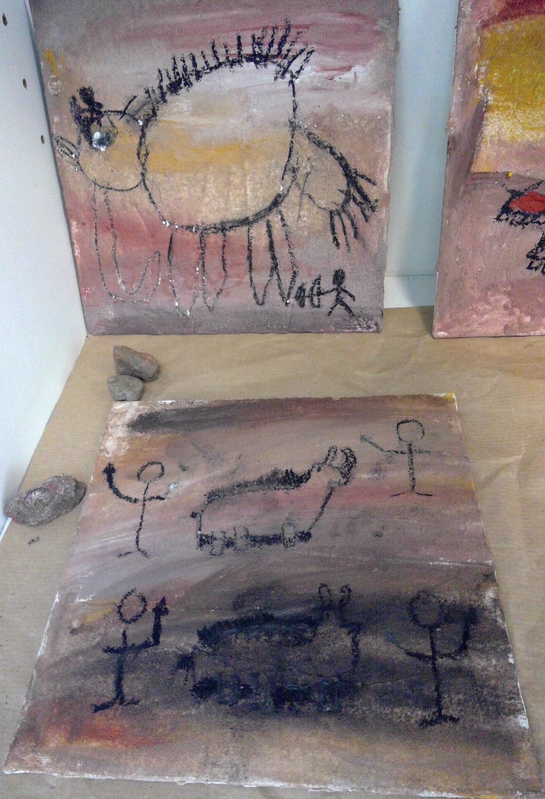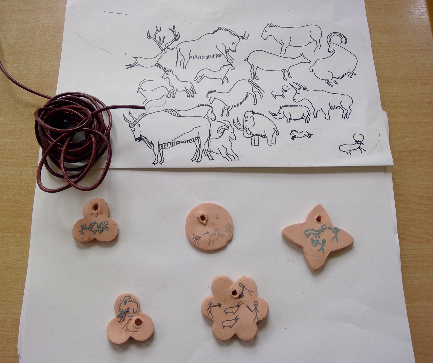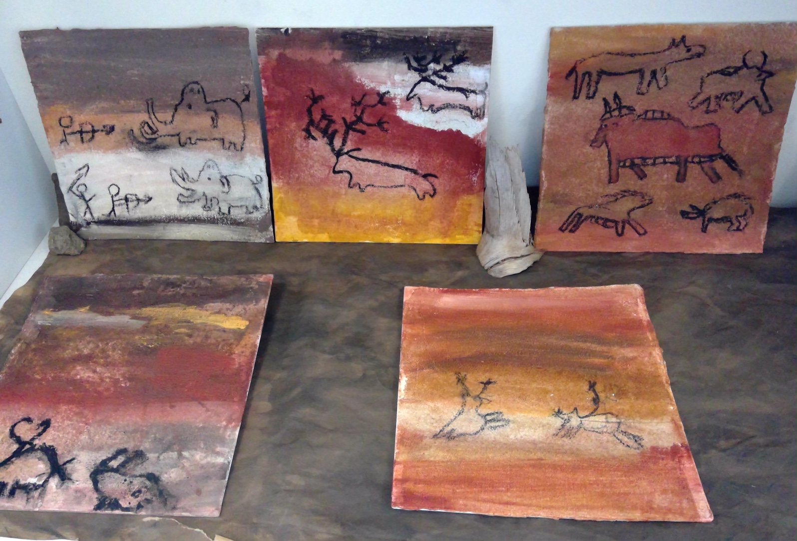 Die Schüler*innen konnten zu selbstgewählten Themenbereichen (Wohnen ,Tiere und Jagd, Höhlenmalerei, …) in Partner- oder Gruppenarbeit ihre Ideen gestalterisch umsetzen.