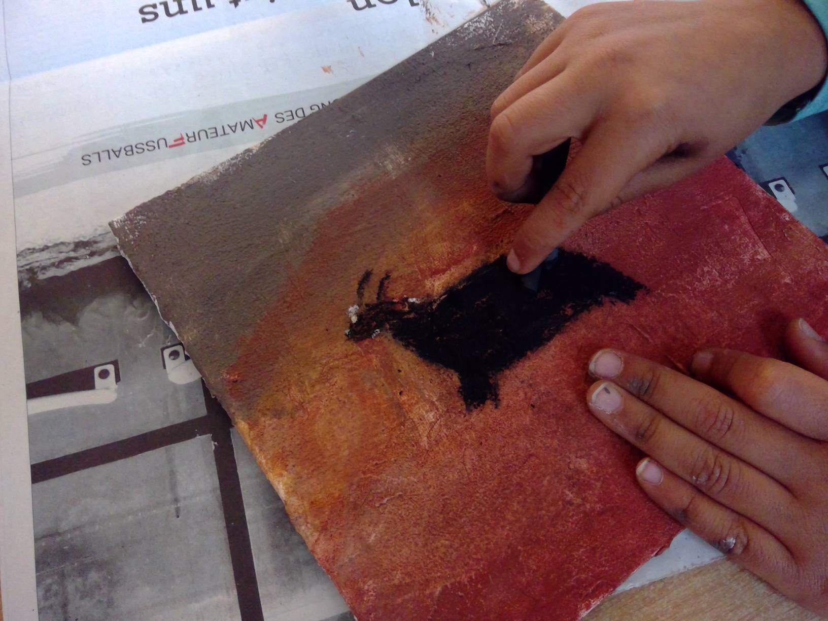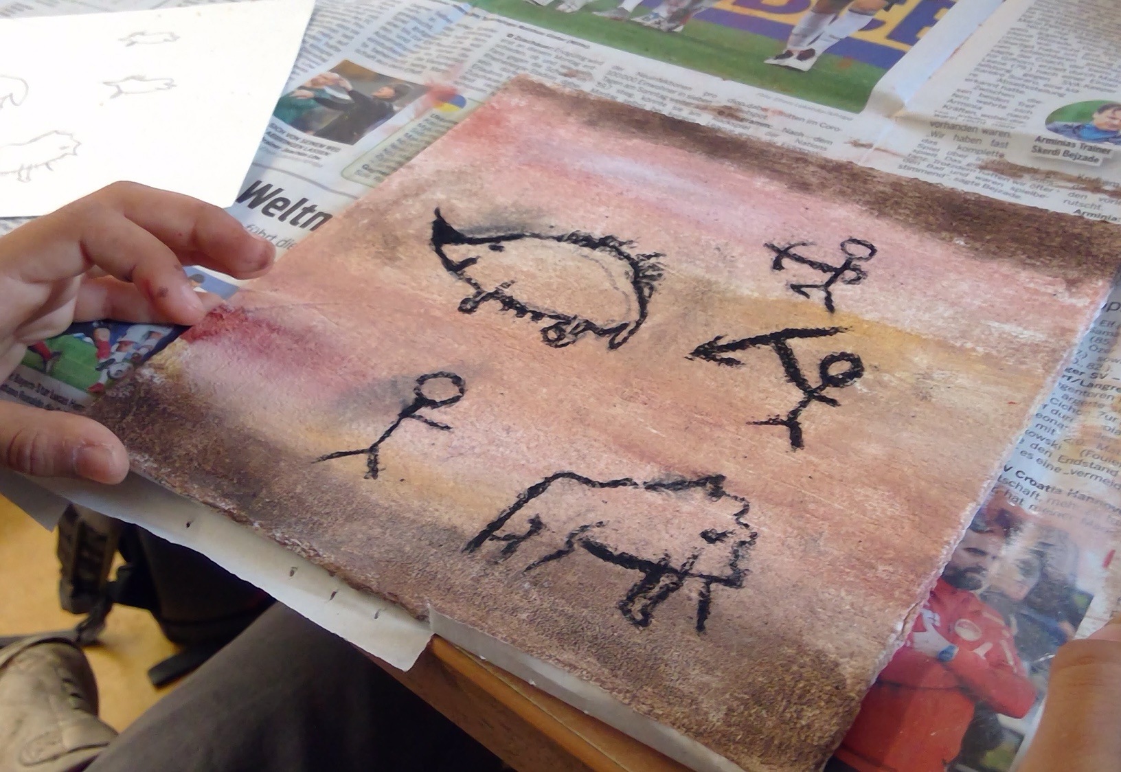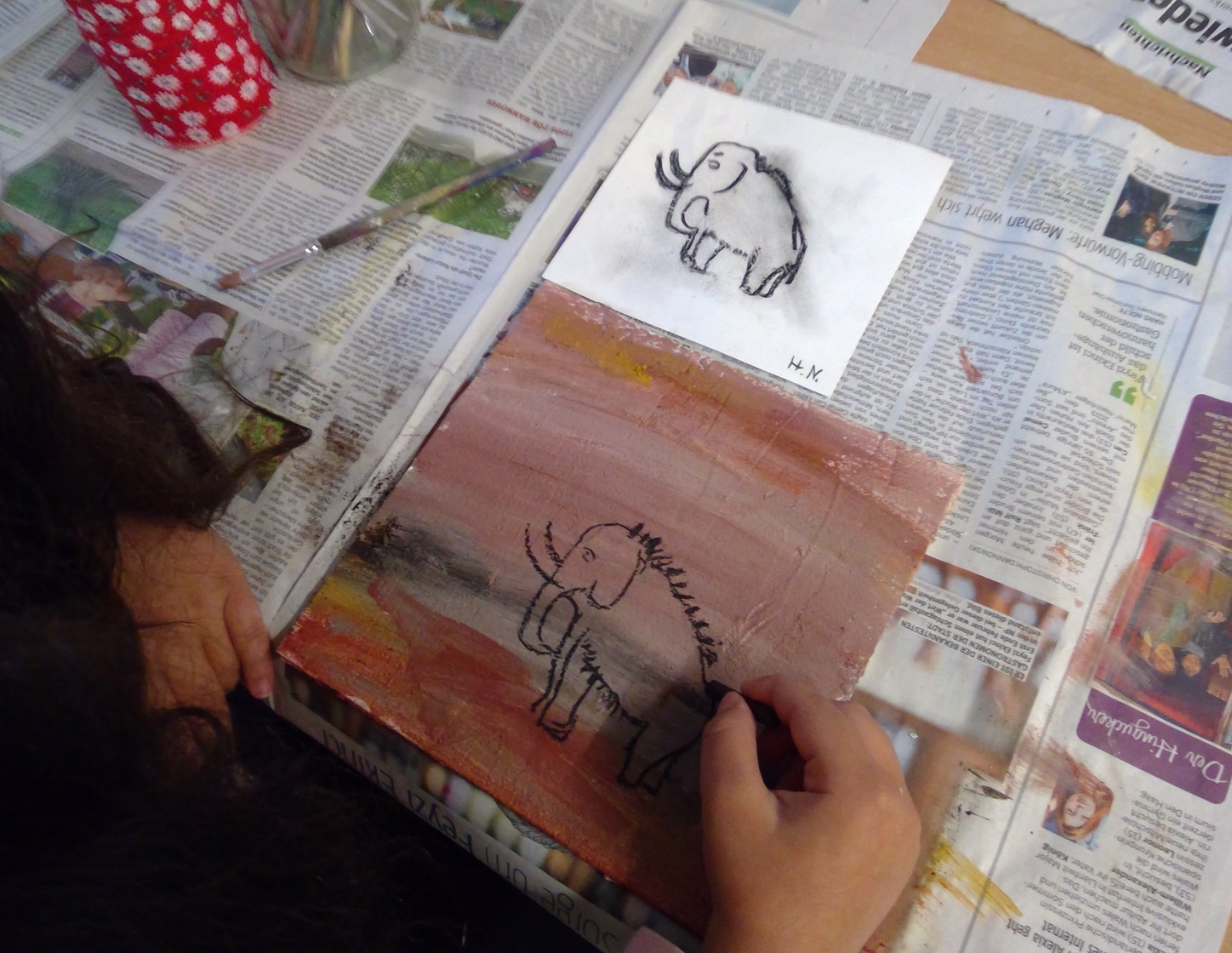 Bei den ” Höhlenmalereien” (nach dem Vorbild der Höhlenmalerei in der Höhle von Lascaux) hat uns der Künstler Herr Khalaf tatkräftig unterstützt. Dieser Tag war ein ganz besonderes Erlebnis für die Kinder und wird uns allen noch lange in Erinnerung bleiben.