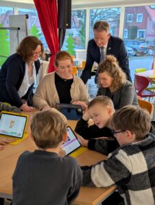 Digital Coachin Martina Schröder zeigt JadeBay-Geschäftsführerin Alexandra Wurm, Bürgermeister der Stadt Wittmund Rolf Claußen und Fachgebietsleiterin des Fachbereichs Personal und Kreisentwicklung beim Landkreis Wittmund Wiebke Börgmann das Programmiertool „ScratchJR.“, während die Schülerinnen und Schüler der dritten Klasse bereits fleißig damit programmieren üben.