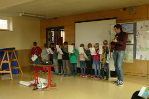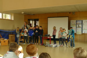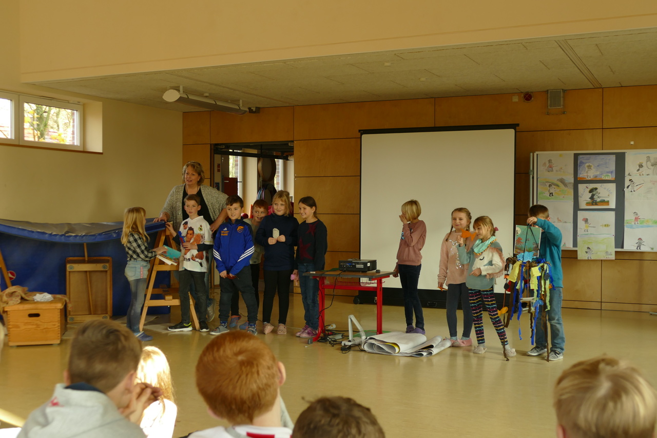 Darauf folgte eine Schülergruppe, die das Buch „Mein Haus ist zu eng und zu klein“ durch ein kurzes Theaterstück vorführte. Eine andere Gruppe stellte den Grüffelo auf Plattdeutsch vor, wobei die Kinder in einem Halbkreis vorne saßen und ein kleinen Ausschnitt des Buches vorlasen. Die nächste Gruppe stellte das Buch „Wo ist Mami“ vor. Auch hier bot es sich an, dies in Form eines Theaterstückes zu machen. Ein weiteres Theaterstück präsentierte die Gruppe, die sich den Tag über mit dem „Flunkerfisch“ beschäftigte, jedoch gab es hier einen kleinen Kniff, denn die Gruppe stellte nur den Anfang des Buches vor, um die Zuschauer zum eigenständigen Weiterlesen zu begeistern.