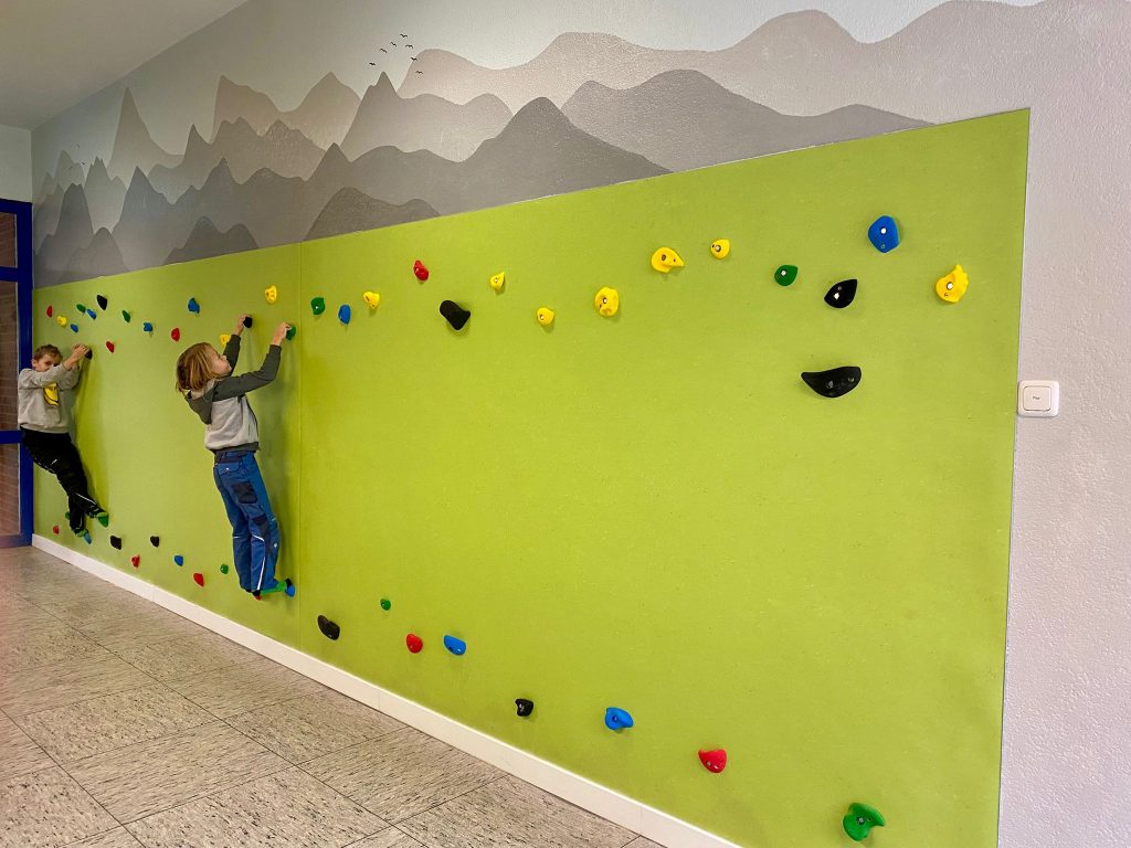 Im Hauptgebäude, auf dem Flur in Richtung Werkraum und Mensa, ist eine wunderschöne Kletterwand entstanden.