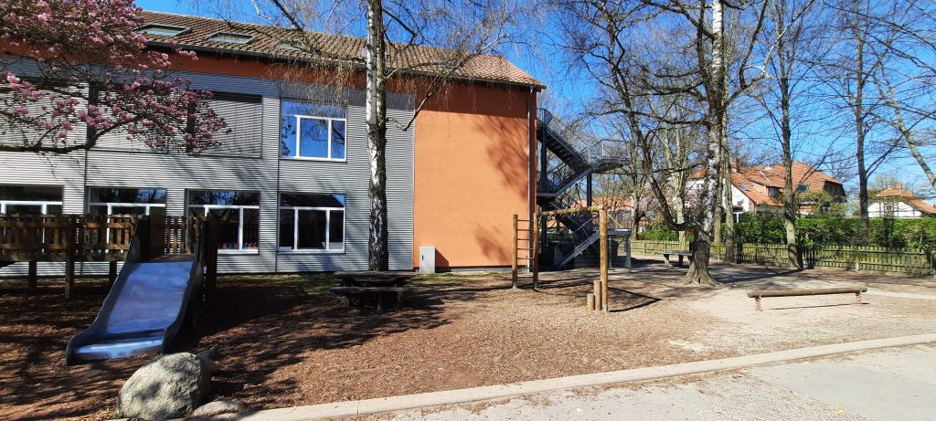 Der Unterricht findet in zwei separaten Schulgebäuden statt. Das großzügige Außengelände – das unsere Gebäude umgibt – und der innenliegende Schulhof bieten den Kindern vielfältige Bewegungsmöglichkeiten und Ruhezonen.