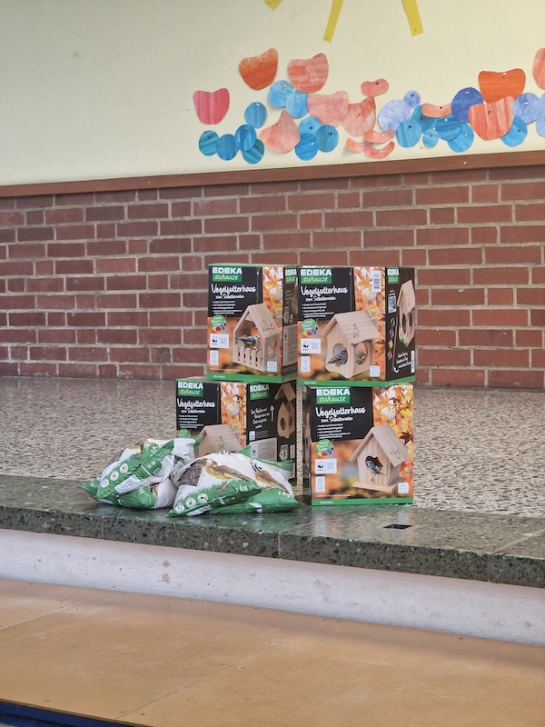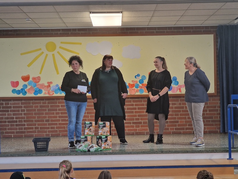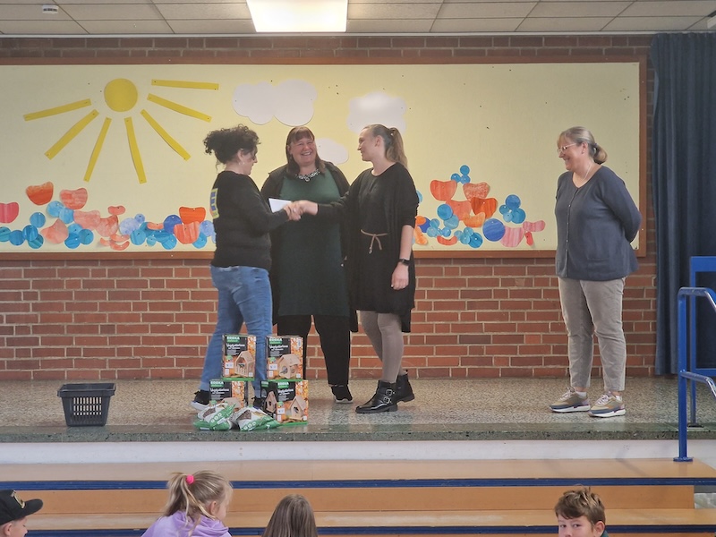 Zuletzt kamen Frau Kaczmarek und Frau Großer (Filialleitung) von Edeka/NP Grasleben auf die Bühne und brachten eine tolle Überraschung für die Schule mit. Durch die Spendenfreundlichkeit ihrer Supermarkteinkäufer wurden 288,93€ gesammelt, die auf 300€ aufgerundet wurden. Dieses Geld soll nun der Grundschule Grasleben zu Gute kommen und wurde von Frau Kalinowski vom Förderverein dankend entgegen genommen. Außerdem erhielt die Schule Bausätze für Vogelhäuser und das passende Vogelfutter für jeden Jahrgang dazu. Vielen Dank für diese tolle Spende.