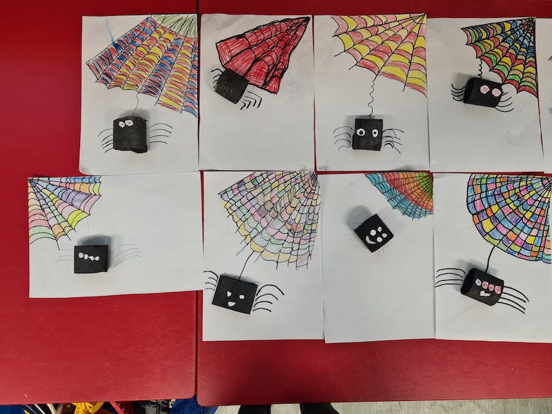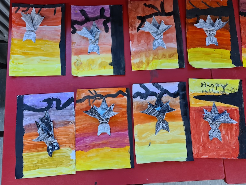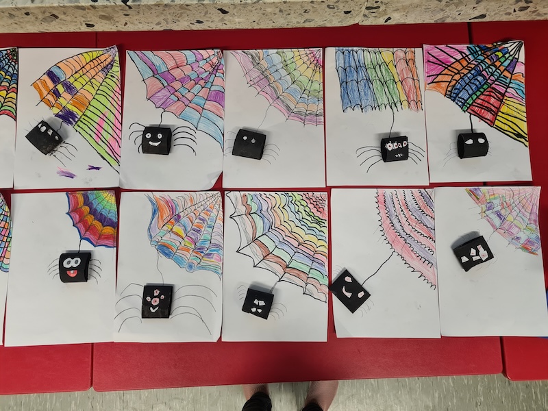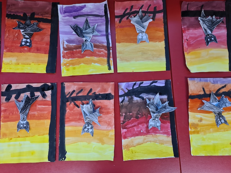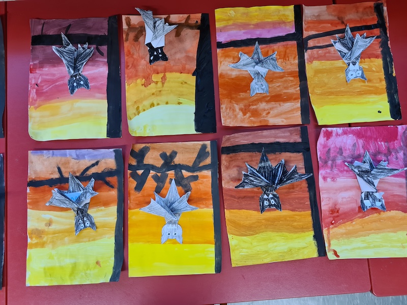 Die Klasse 2b hat sich im Rahmen des Kunstunterrichts mit dem Thema Halloween beschäftigt und Fledermausbilder sowie Spinnenbilder gestaltet.