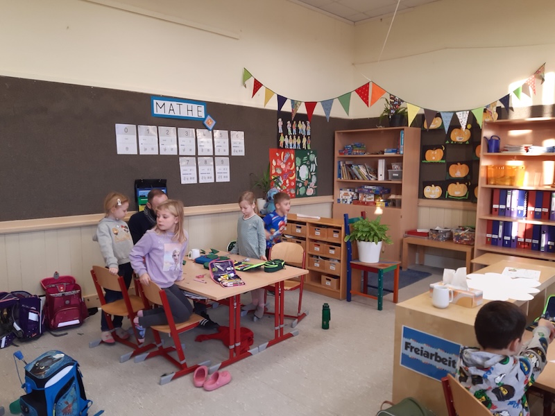 Die Aufregung war groß, als der erste Ausflug für unsere neuen Erstklässler und Erstklässlerinnen begann. Mit Regenjacken, Gummistiefeln und Matschhosen gerüstet, stiegen alle Kinder gemeinsam mit Frau Roth, Frau Schlycht und Frau Wolter in den Bus, der sie zum Maislabyrinth gefahren hat. Einen kurzen Fußmarsch mit Pfützenspringen später, konnte das Stempelsuchen im Labyrinth losgehen. Am Ende haben auch alle Kinder den Weg wieder aus dem Labyrinth gefunden, sodass noch Zeit für den Streichelzoo war. Es wurden Ziegen und Kaninchen gefüttert und gestreichelt. Natürlich wurden auch ein paar Süßigkeiten und Andenken am Kiosk gekauft.