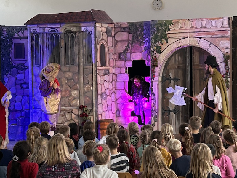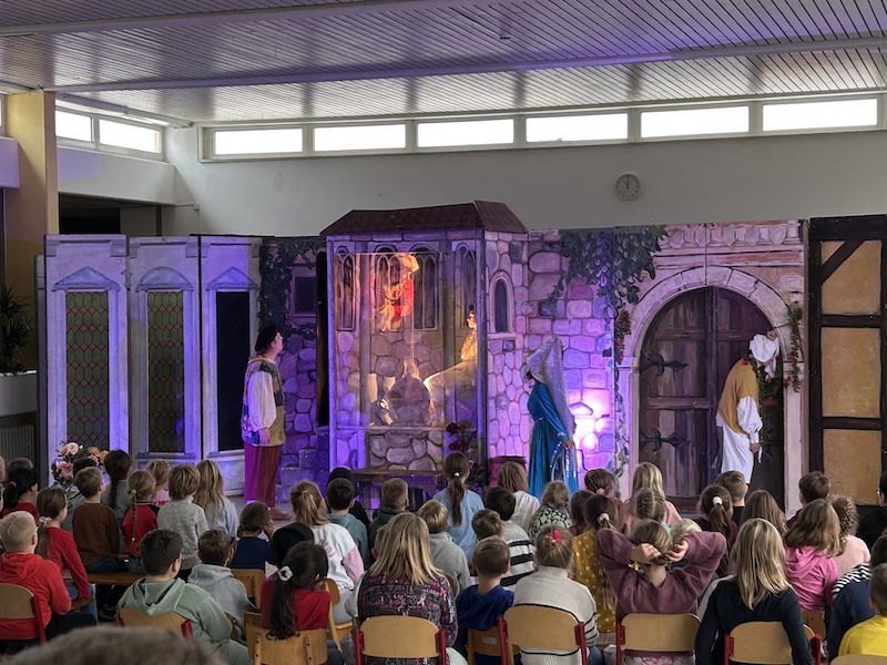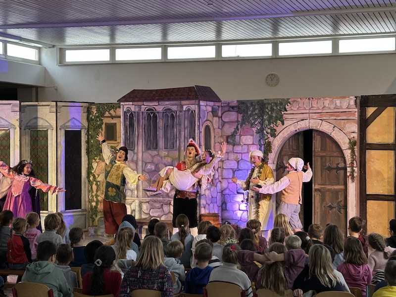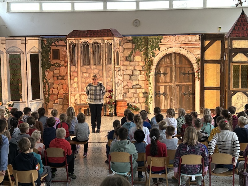 Dieses Jahr verzauberte das Tournee Theater Hamburg die Grundschule Grasleben mit dem Märchen Dornröschen. Vor einer wunderschön gestalteten Kulisse führte die Gruppe die Geschichte der verfluchten Prinzessin auf, die in einen 100-jährigen Schlaf fiel, als sie sich an einer Spindel in den Finger stach. Auch wenn das viele Gähnen ansteckend wirkte, verfolgten die Kinder das Geschehen aufmerksam und ließen sich voll und ganz mitreißen. Gleichzeitig hatten sie eine Menge zu lachen und konnten sich interaktiv in das Stück mit einbringen und fieberten zum Ende hin richtig mit den Figuren mit. Auch gesanglich wurden die Schülerinnen und Schüler in das Stück integriert. Insgesamt war es eine schöne Aufführung für Groß und Klein.