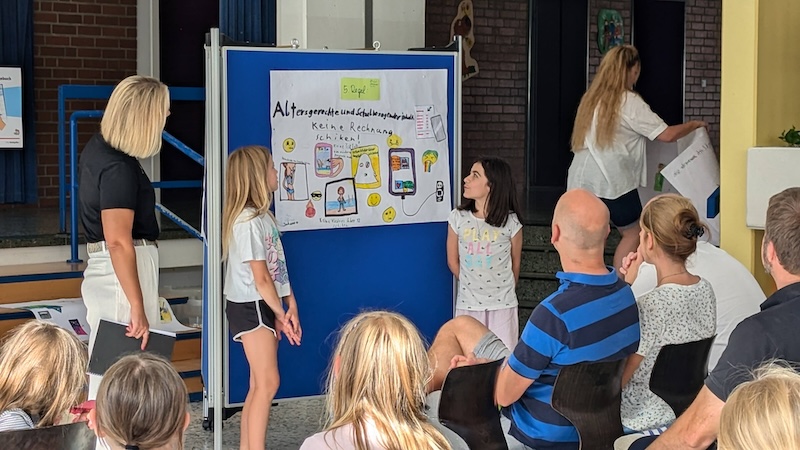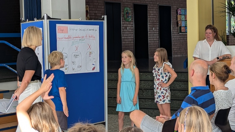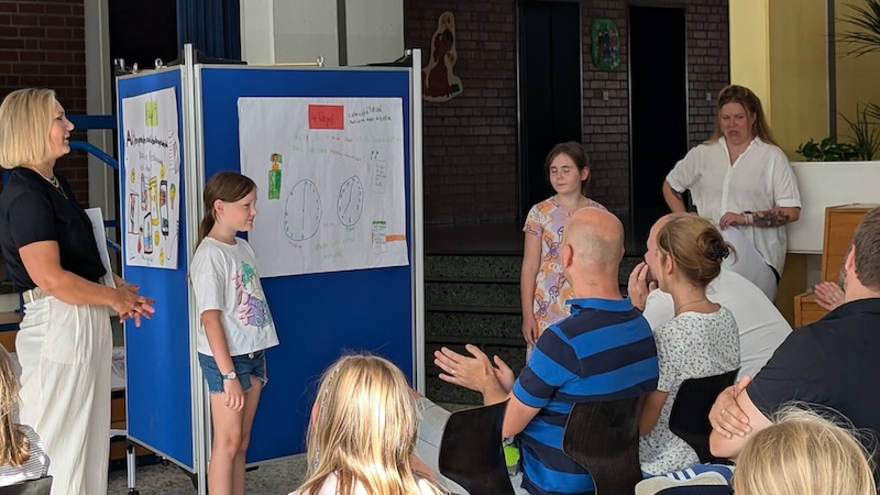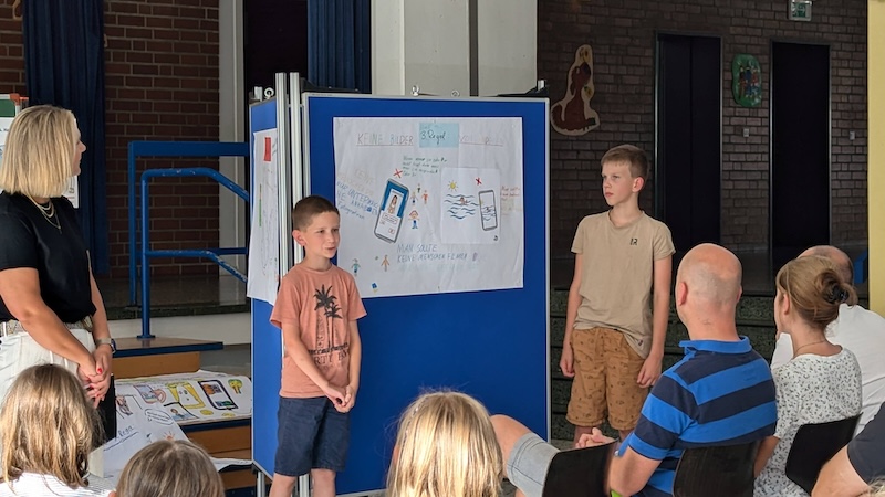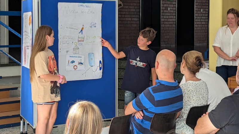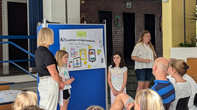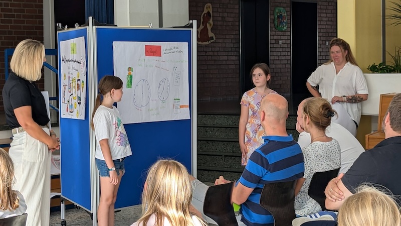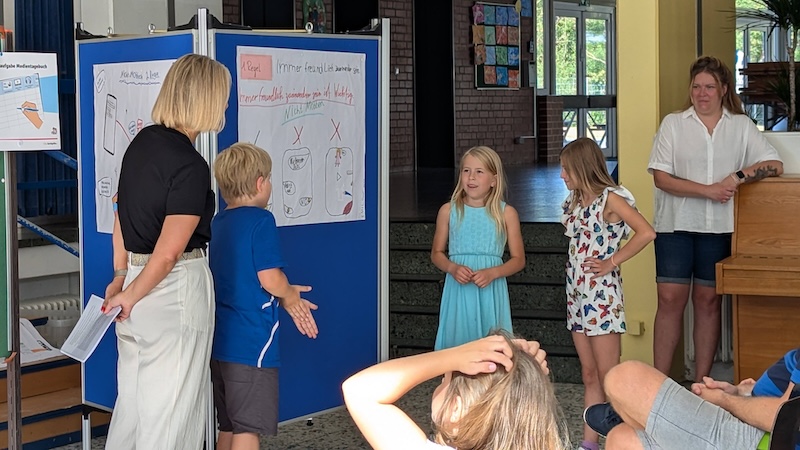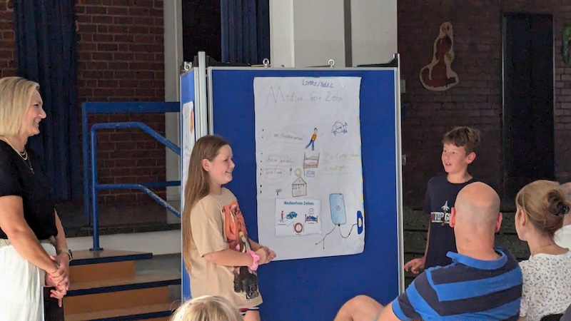 Die Zeit des Klassenlehrerunterrichts der ersten Schulwoche nutzte die Klasse 4b für einen Workshop zum Thema Mediennutzung. Unter Anleitung von Frau Stielau und Frau Weitemeier vom LK Helmstedt begleiteten sie die Zwillinge Max & Min@ auf dem Weg zum eigenen Smartphone. Während des zweitätigen Workshops ging es um die Vor- und Nachteile digitaler Medien, den Umgang mit persönlichen Daten im Internet und die eigene Mediennutzung, wofür sowohl Kinder als auch Erwachsene einen Tag lang ein Medienprotokoll führten. Die Ergebnisse präsentierte die Klasse den Eltern an einem Elternnachmittag: dort stellten sie die erarbeiteten Medienregeln vor, aber auch das sensible Thema Cybermobbing sowie Möglichkeiten der Freizeitgestaltung ohne digitale Medien wurden besprochen. Ganz schön aufregend, vor so vielen Zuschauern zu sprechen, aber alle Kinder haben es souverän gemeistert! Stolz konnte die Klasse am Ende ein Zertifikat über die absolvierte Teilnahme entgegennehmen. Wir bedanken uns herzlich bei Frau Stielau und Frau Weitemeier für den tollen Workshop und dass sie sich die Zeit für uns genommen haben!