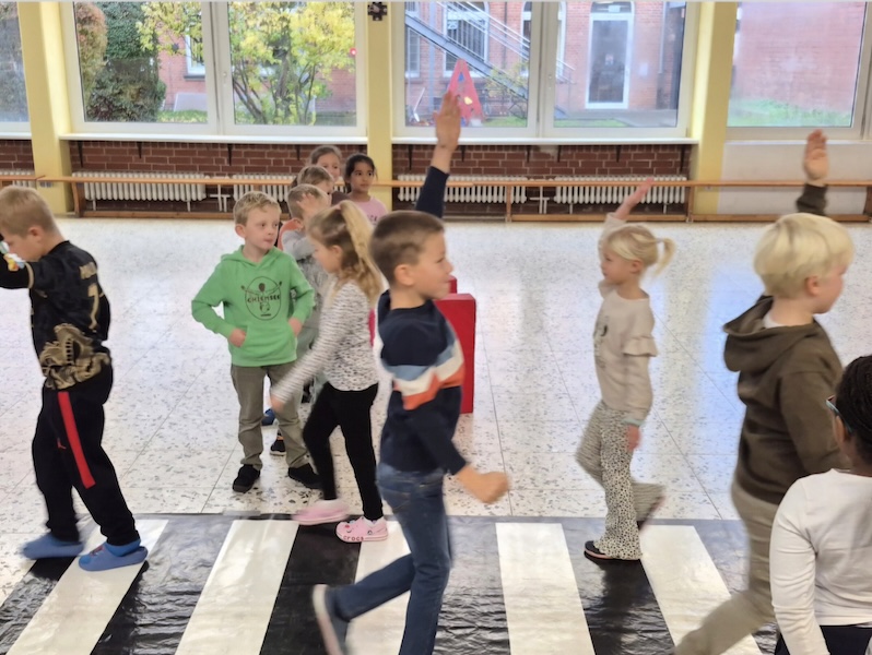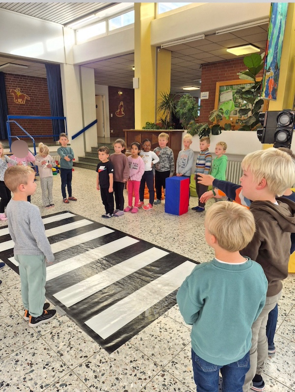 Im Oktober 2025 bekamen die neuen ersten Klassen Besuch vom Adacus. Gemeinsam mit Herrn Pinkpank vom ADAC trainierten die Kinder Verkehrssicherheit beim Überqueren der Straße. Alle Kinder haben sowohl das Verhalten am Fußgängerüberweg mit und ohne Ampel toll gemeistert und durften sich über eine Urkunde freuen. Wir bedanken uns bei Herrn Pinkpank ebenso wie bei der Öffentlichen für die Ausstattung mit gelben Sicherheitswesten für die dunkle Jahreszeit!