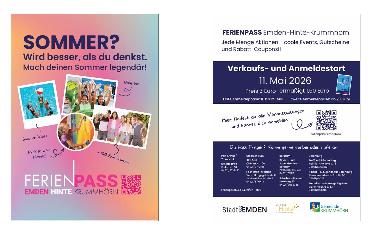 Abgerundet und vervollständigt wird das Angebot auch diesmal durch die beliebten Gutscheine und Rabatt-Coupons. So können sich die Teilnehmer*innen während der Sommerferien über freien bzw. ermäßigten Eintritt für diverse Einrichtungen in Emden und Umgebung freuen oder das Freiticket fürs Busfahren in Anspruch nehmen.