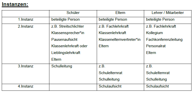 • Ist keine innerschulische Lösung des Konflikts möglich, wenden sich die Beteiligten an die Schulaufsicht, Schulpsychologie, Suchtberatung, u. a., je nach Art des Beschwerdefalles.