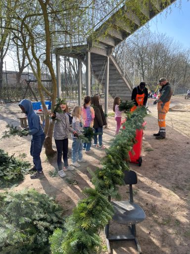 Als erste vorbereitende Arbeiten wurden im Kunstunterricht Osterdekorationen hergestellt, Ostereier sortiert und für das Aufhängen am grünen Kranz präpariert sowie mit der Unterstützung unseres Hausmeisters Ludger und Mike vom Bauhof zwei grüne Kränze gebunden. Die Kinder des 2. Jahrgangs waren mit Eifer bei der Sache und hatten viel Freude bei strahlendem Sonnenschein.