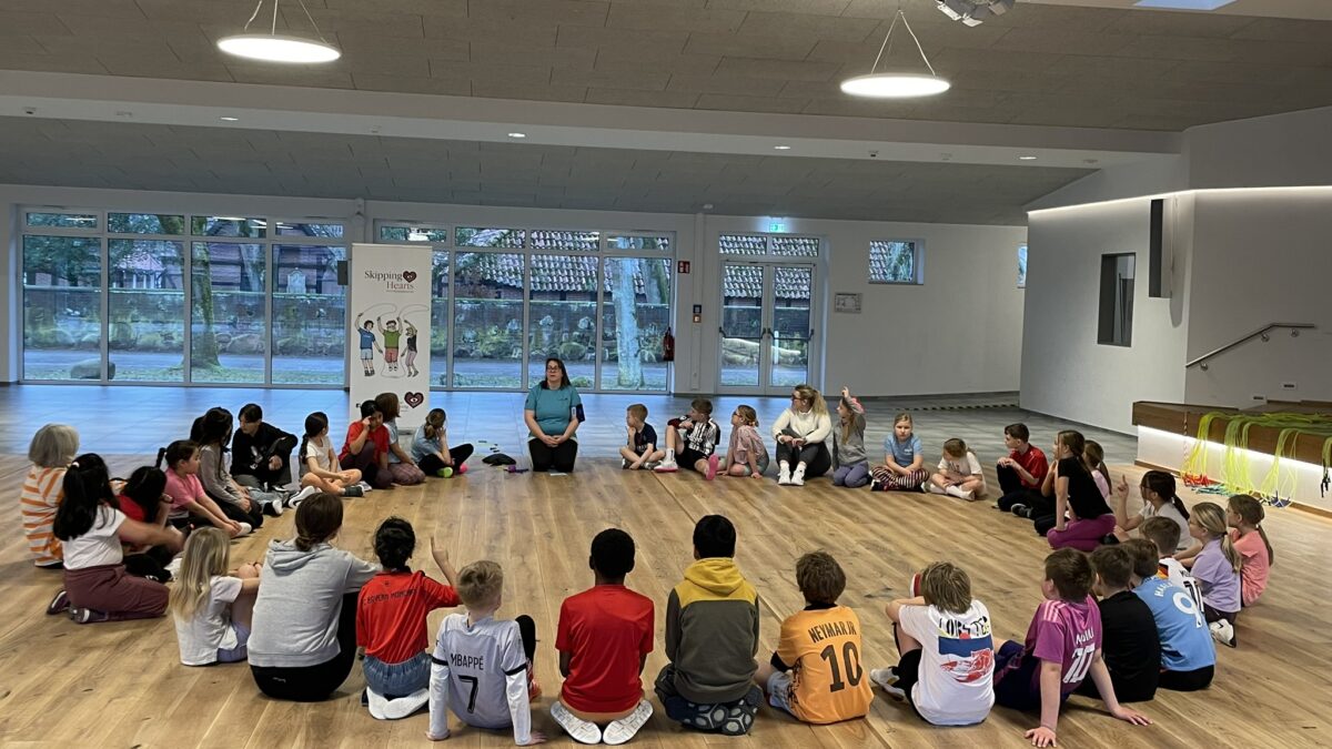 Heute nahm der gesamte 3. Jahrgang mit großer Begeisterung am Skipping Hearts Workshop (www.skippinghearts.de) teil. Ziel des Projekts ist es, Kinder frühzeitig für die Bedeutung von Bewegung zu sensibilisieren und die Stärkung des Herzmuskels spielerisch zu fördern. Zu Beginn erfuhren die Schülerinnen und Schüler, warum regelmäßige sportliche Aktivität so wichtig für ein gesundes Herz ist. Anschließend ging es direkt in die Praxis: Mit viel Energie und Motivation wurden zahlreiche Seilsprünge eingeübt. Vom Basic-Sprung über Partnerübungen bis hin zum anspruchsvollen „Criss Cross“ war alles dabei. Mit großer Freude probierten die Kinder die verschiedenen Techniken aus und wuchsen dabei über sich hinaus. Besonders spannend war es für sie, selbst zu spüren, wie ihr starkes Kinderherz bei Bewegung schneller schlägt – ein eindrucksvolles Erlebnis, das die Bedeutung von Sport unmittelbar erfahrbar machte. Ein herzliches Dankeschön gilt Frau Rafkes vom Skipping Hearts Team, die den Workshop mit viel Engagement, Geduld und guter Laune durchgeführt hat. Es war ein rundum gelungener Tag voller Bewegung und Begeisterung!