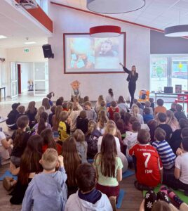 In der Mensa versammelten sich alle Kinder der Jahrgangsstufen 1 bis 4 und nahmen gespannt Platz. Von der ersten Minute an spitzten sie neugierig die Ohren und tauchten begeistert in die Geschichte rund um das liebenswerte und besondere Pudelschwein ein.
