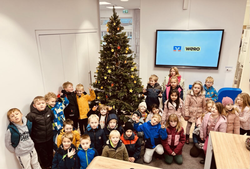 Die Schülerinnen und Schüler der Klassen 1a und 1b haben mit viel Freude den Weihnachtsbaum im Eingangsbereich der Volksbank Heede geschmückt. Nun erstrahlt er in bunten Farben und sorgt für festliche Stimmung. Als kleines Dankeschön erhielten die Kinder leckere Schokolade – eine schöne Belohnung für ihren Einsatz.