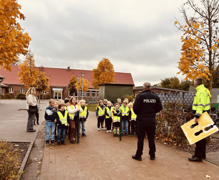 Im Rahmen des Projekts „Gelbe Füße – sicherer Schulweg“ haben die Erstklässlerinnen und Erstklässler unserer Schule gemeinsam mit der Polizei wichtige Regeln für mehr Sicherheit im Straßenverkehr kennengelernt. Zusammen brachten sie gut sichtbare gelbe Markierungen auf den Gehwegen an, die den Kindern zeigen, wo sie vor dem Überqueren der Straße sicher stehen können. So werden die Schulanfänger Schritt für Schritt zu echten Verkehrsexperten.