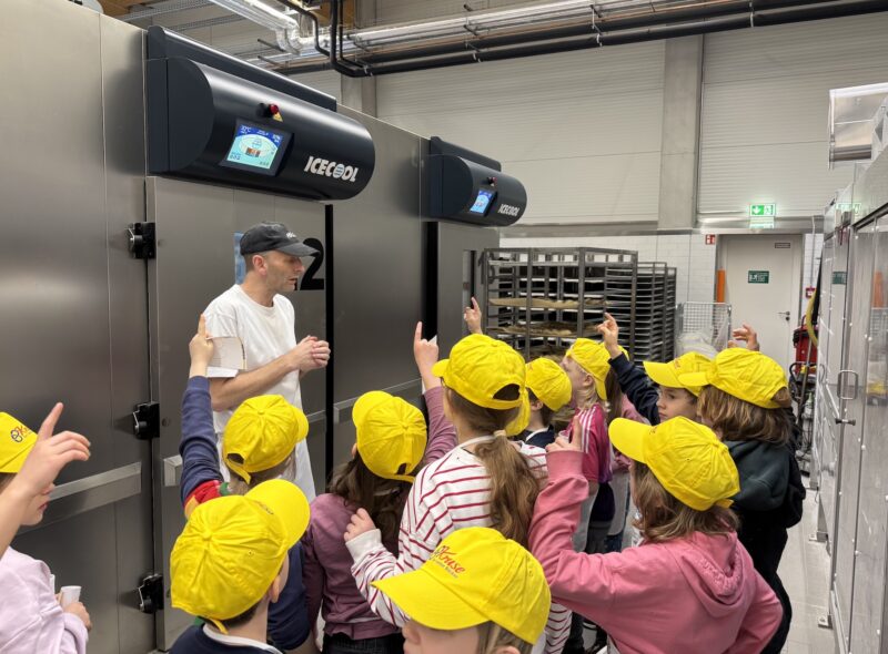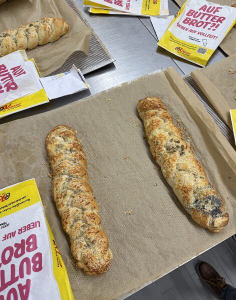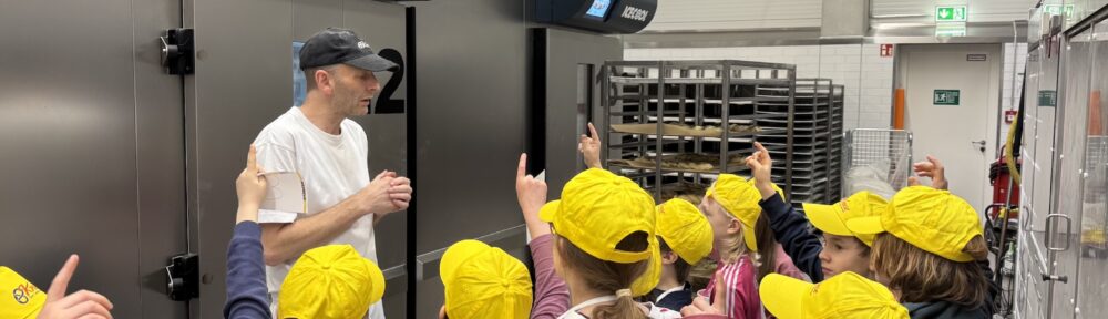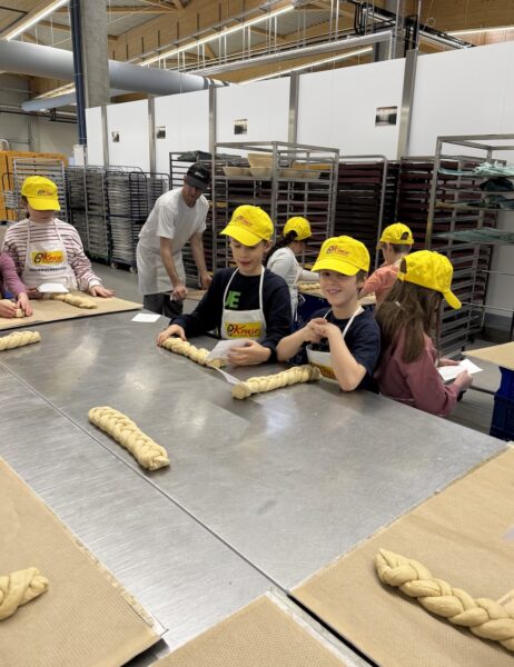 Alle Kinder wurden mit der korrekten Arbeitskleidung ausgestattet und dann durfte das Backabenteuer starten! Eigene Hefezöpfe ausrollen, flechten, belegen und backen! Anschließend gab es eine kleine Stärkung (hauseigene Muffins) und ein kleiner Rundgang durch die Produktion durfte natürlich auch nicht fehlen. Danach waren unsere selbstgebackenen Hefezöpfe fertig und durften schon einmal von uns probiert werden! Lecker 🙂