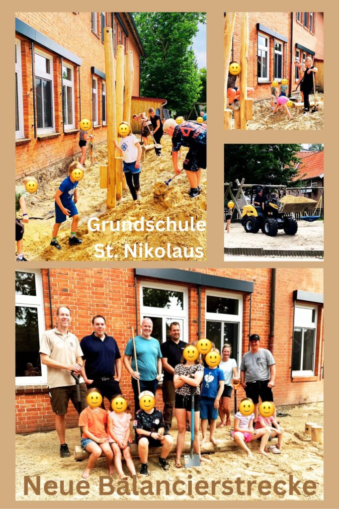 Während der Ferien packten einige Eltern unter der Regie von Johannes Fleddermann tatkräftig mit an, um die Anlage vorzubereiten und im Nachgang etliche Kubikmeter Sand zu verteilen. Auch viele Kinder waren eifrig dabei, unterstützten ihre Eltern fleißig und konnten es kaum erwarten, die Strecke endlich auszuprobieren. Die Zusammenarbeit mit den Firmen Garten- und Landschaftsbau Lüske, die die Balancierstrecke aufbauten, und Tiefbau und Sandgruben van der Ahe, die den Sand lieferten, ging Hand in Hand, sodass das gemeinsame Projekt Balancierstrecke pünktlich zum Ende der Sommerferien bespielt werden konnte.