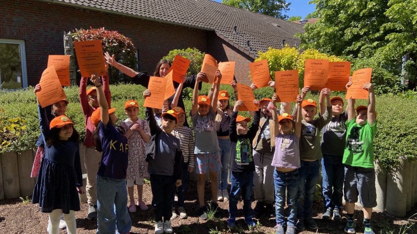 Stolz präsentieren die frischgebackenen Pausenhelfer ihre Urkunden und Käppis. Nach einer mehrwöchigen Ausbildung freuen sich die SuS jetzt endlich aktiv in der Pause helfen zu dürfen. Das Konzept “Kinder helfen und unterstützen Kinder” hat sich bewährt und dank engagierter “Nachwuchskräfte” können wir es an der Holbeinschule fortführen.