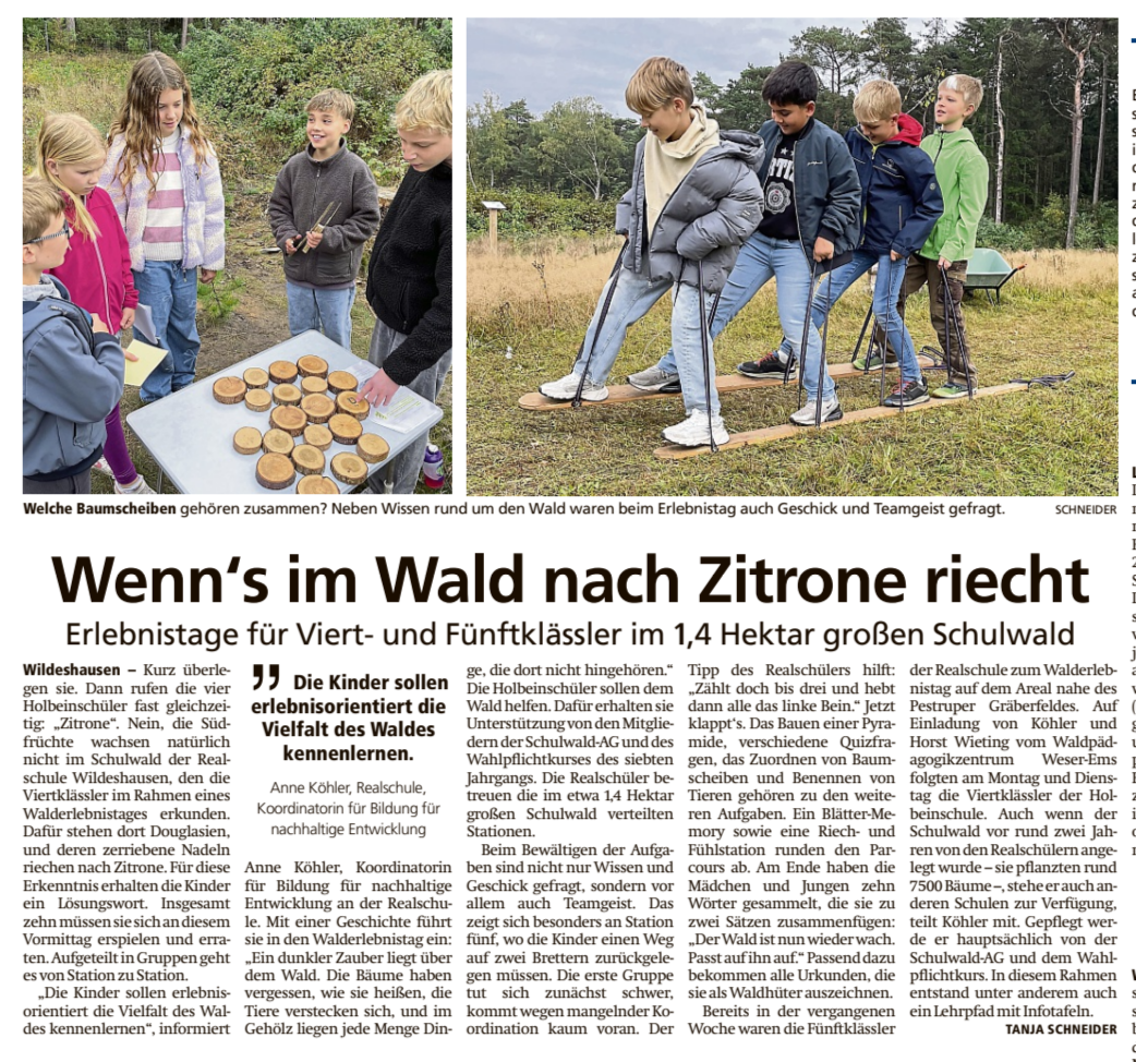 Unsere Viertklässler durften an den Walderlebnistagen der Realschule teilnehmen. Im schuleigenen Waldgebiet konnten die Kinder spannende Einblicke in die Natur gewinnen und dabei mehr über die Bäume erfahren, die von der Realschule selbst gepflanzt wurden.