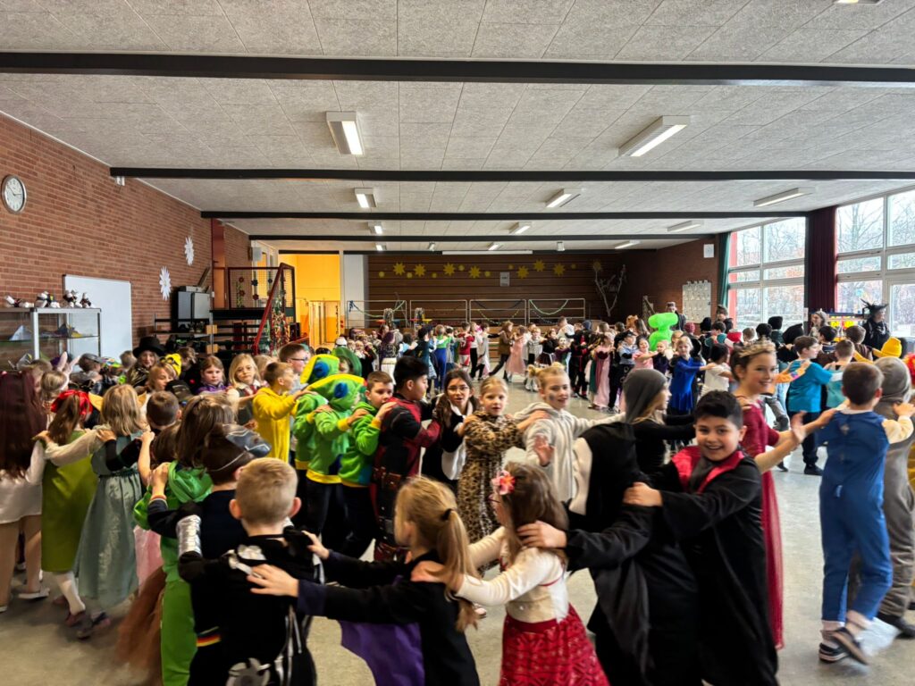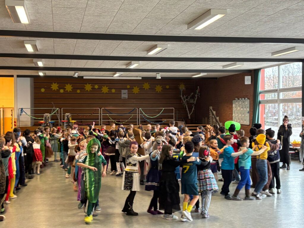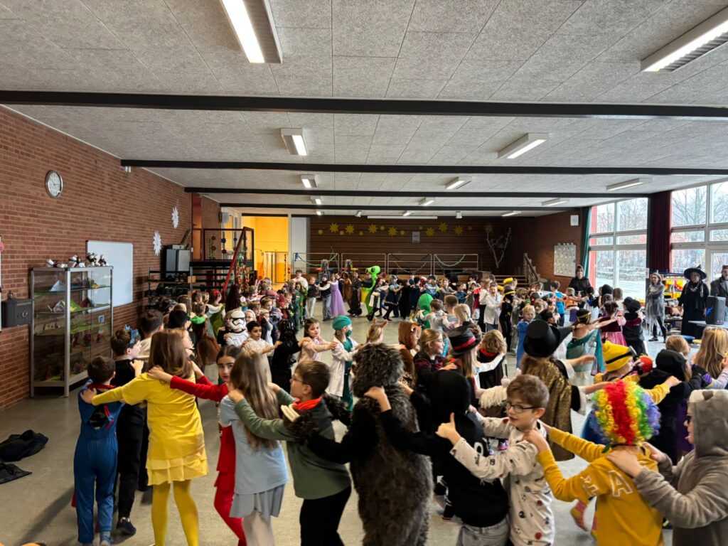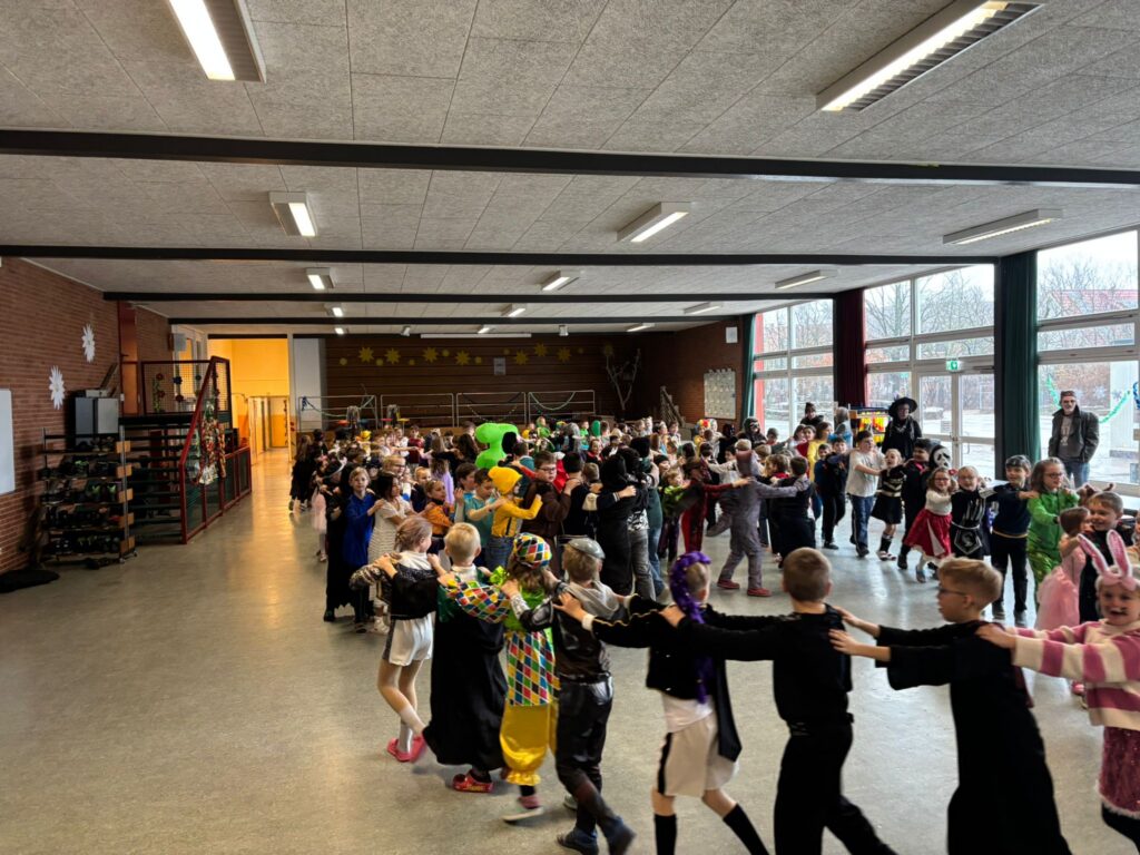 Ein besonderes Highlight war die fröhliche Polonaise durch die ganze Schule. Gemeinsam zog die ganze Schulgemeinschaft lachend und tanzend durch die Gänge bis in die Aula. Dort fand anschließend eine tolle Disco statt. Zu mitreißender Musik wurde getanzt, gesungen und gefeiert. Die Stimmung war großartig und die Aula verwandelte sich in eine richtige Faschingsparty!