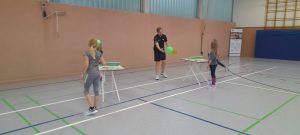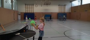 An der dritten Station gab es drei Tische, an denen man mit einem Partner entweder Luftballons oder einen Tischtennisball hin und her spielte.