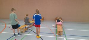 An der zweiten Station gab es zwei Bänke, auf denen man den Ball mit einem Schläger anstupsen musste, so dass der Ball in einen Korb am Ende fällt. Mit jedem Mal musste man ein bisschen weiter nach hinten rutschen.