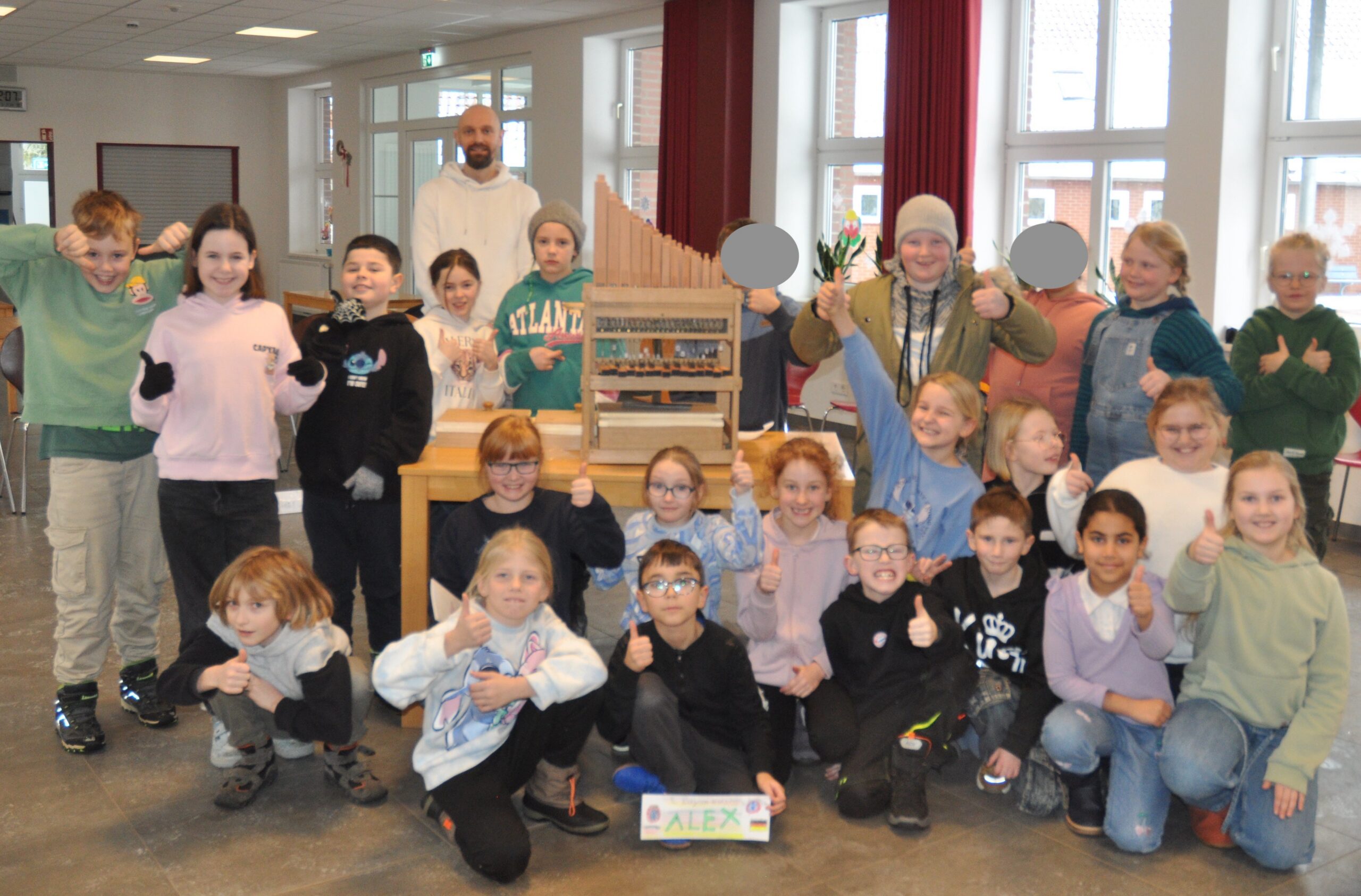 Am Donnerstag, den 05.02.2026 besuchte der Löninger Organist Oliver Strauch unsere Schule. Im Rahmen des Musikunterrichts beschäftigen sich die 3. Klassen mit der sogenannten Königin der Instrumente: die Orgel. Unter Anleitung Oliver Strauchs bauten die Kinder ein Orgelmodell zusammen. Anschließend durften sie mit vereinten Kräften selber kleine Organisten werden und der Orgel hohe und tiefe sowie leise und laute Töne entlocken. Alle Kinder waren fasziniert von der Technik und Funktionsweise des Instrumentes. Wir danken Oliver Strauch nochmals herzlich für diesen musikalisch zauberhaften Tag.