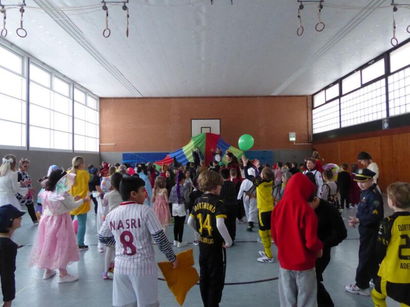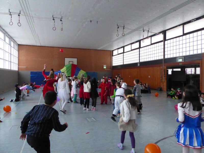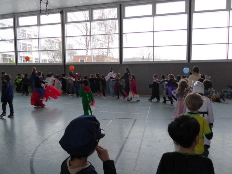 In den ersten zwei Stunden wurde in der Klasse getanzt, gespielt und lecker gefrühstückt. Danach hat sich die ganze Schule in der Turnhalle getroffen. Es gab eine Polonäse, es wurde getanzt und die einzelnen Verkleidungen gewürdigt. Danach war noch Zeit, um in den Klassen weiter zu feiern.