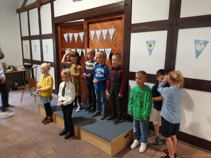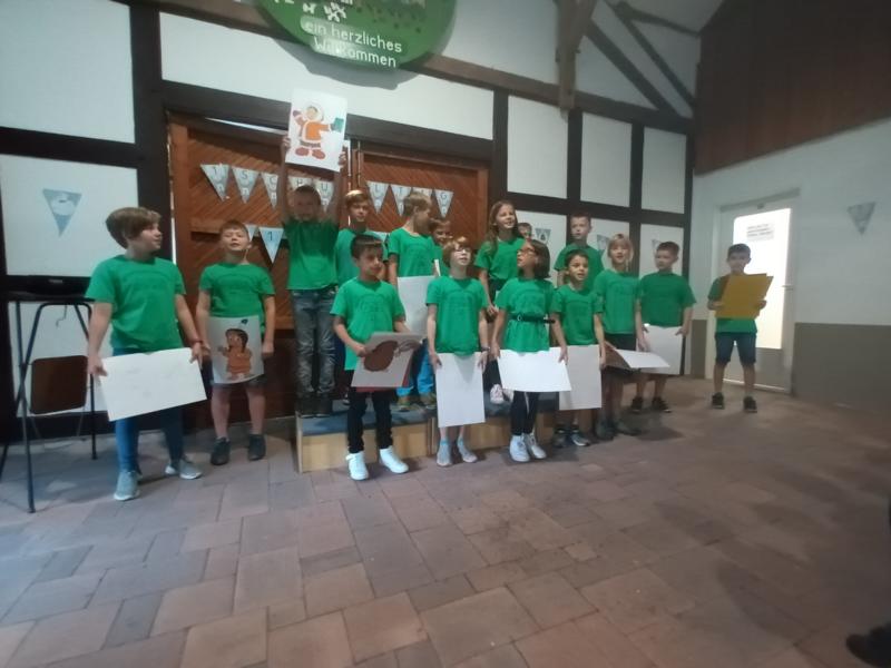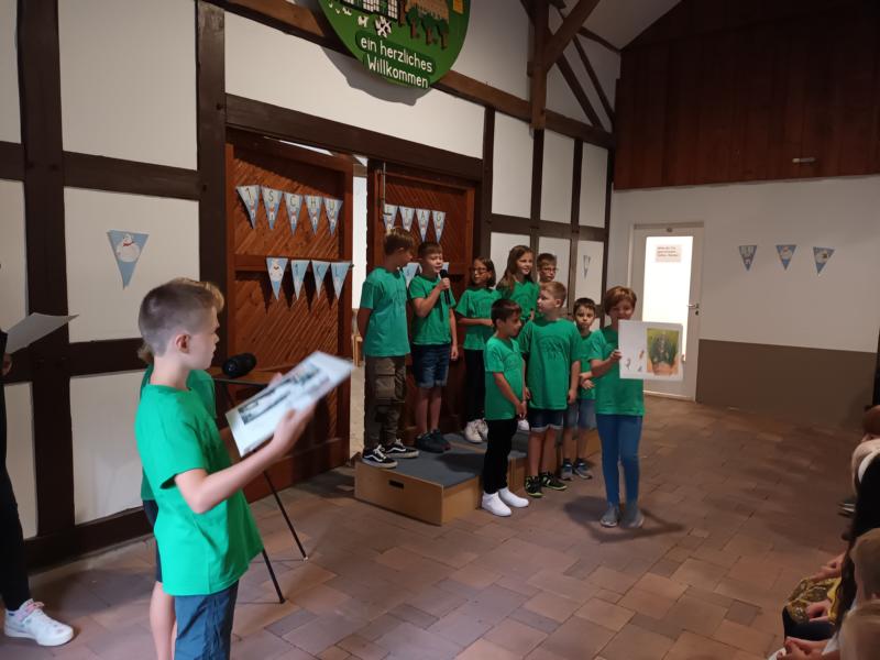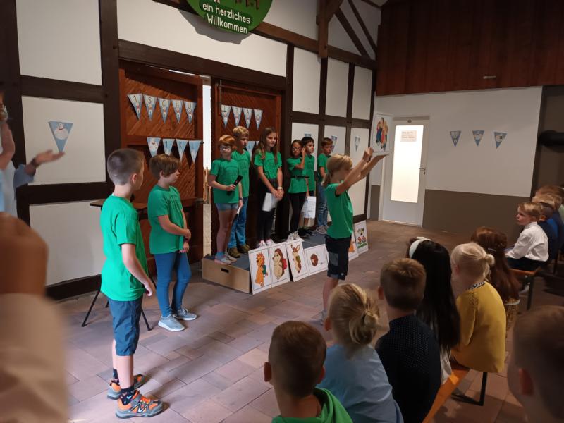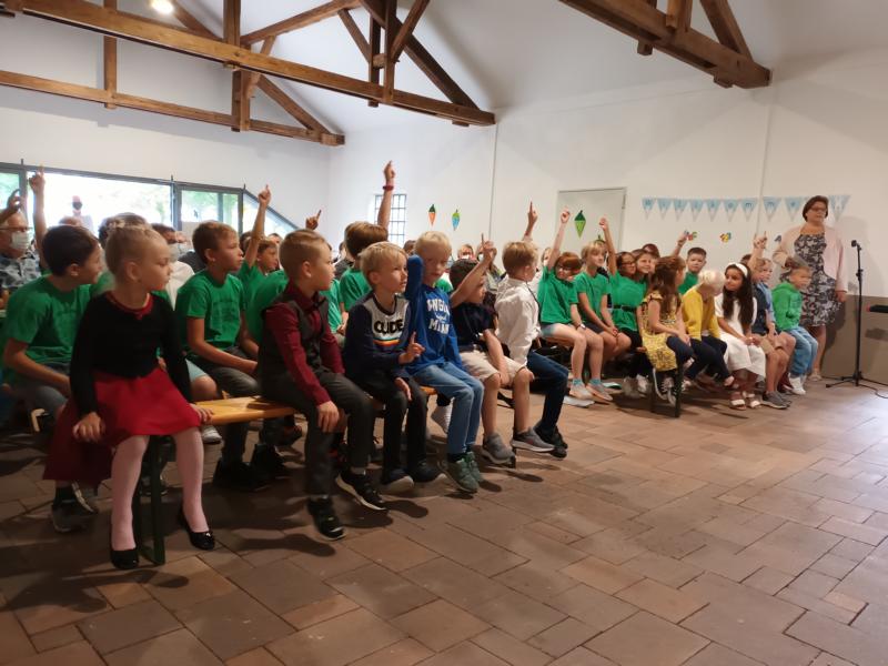 Am Samstag, dem 27.8.2022, war der große Tag für die neuen Schulkinder gekommen. Die elf Einschulungskinder kamen mit ihren Eltern, Verwandten und Bekannten in die Sägemühle, wo in diesem Jahr zum ersten Mal die Einschulungsfeier stattgefunden hat. Ein abwechslungsreiches Programm, welches von der 4. Klasse vorbereitet wurde, führte durch die Feier. Zum Glück hatte der Regen nach der Feier aufgehört, sodass die Einschulungskinder zusammen mit ihrer Klassenlehrerin Frau Hölscher und ihren Paten den Weg zur Schule zu Fuß absolvieren konnten. In der Schule angekommen, erhielten die Kinder ihre erste Unterrichtsstunde. In der Zwischenzeit versorgten der Förderverein und die Eltern der Klasse 2 die gespannt wartenden Gäste mit Kaffee und Kuchen.