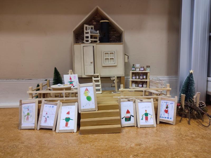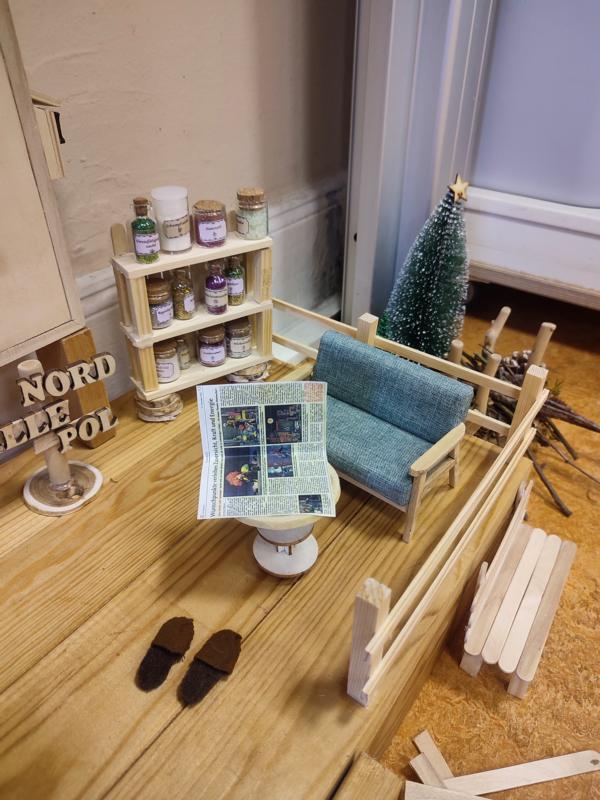 Auf seiner Terrasse hat Tomte einige Möbel stehen. Sogar einen Adventskranz mit 4 kleinen Kerzen hat Tomte. Außerdem gibt es ein Regal mit Zauberpulvern. Das war auch schon heute sehr wichtig, denn die Kinder haben im Kunstunterricht nach den genauen Angaben von Tomte ein Bild gemalt. Anschließend wurde das Bild mit Schrumpfzauber bestreut, damit die Bilder auch in das Wichtelhaus passen. Ob daswohl klappt?