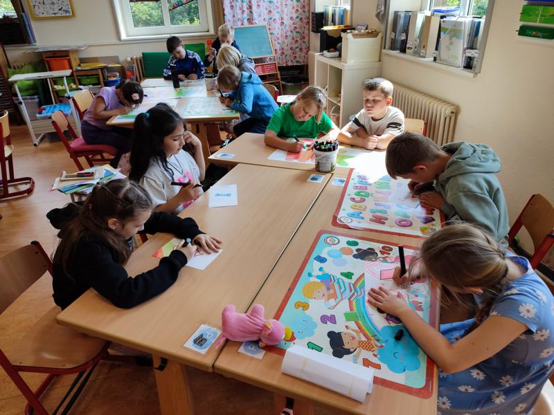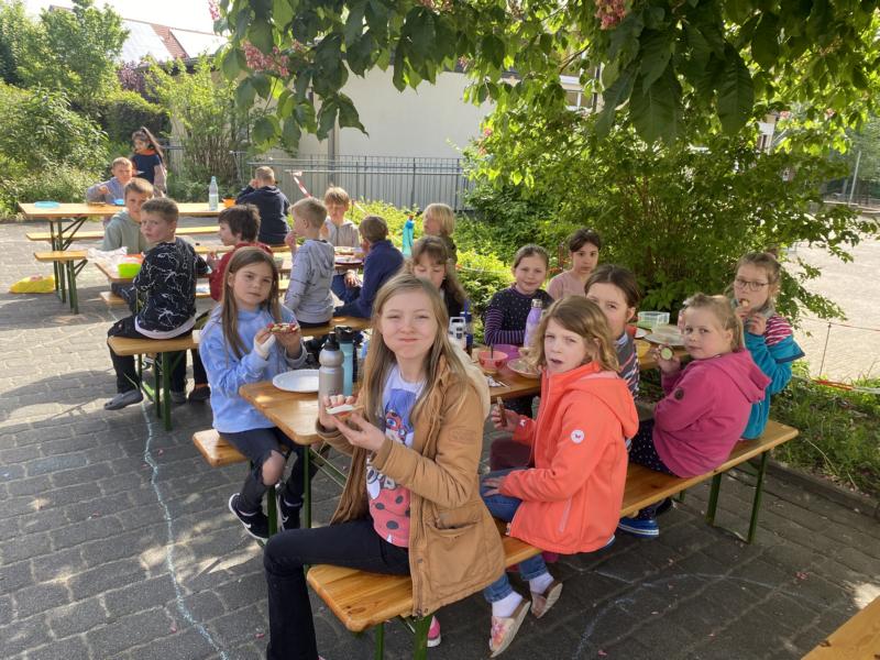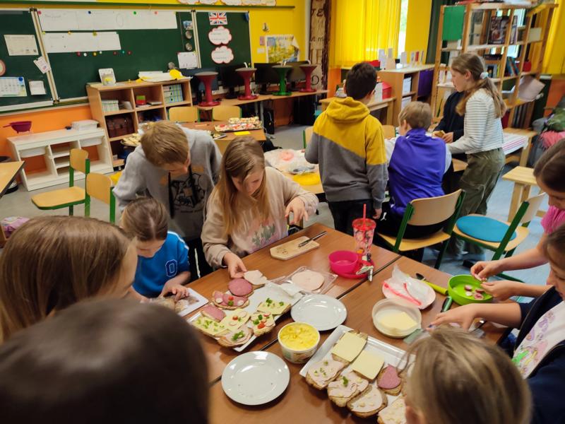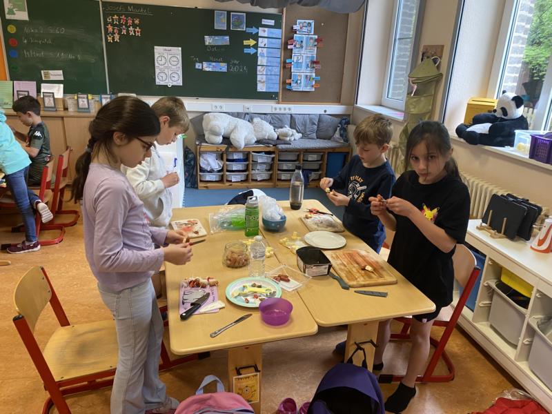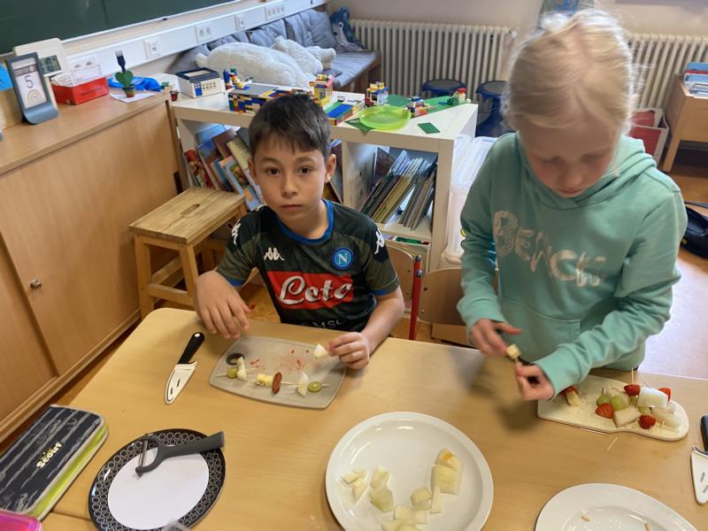 Während die Erstklässler ihre Rollerführerscheinprüfung ablegten, bereiteten die anderen Schülerinnen und Schüler ein leckerer Frühstück für die ganze Schule vor. Es wurden Obstspieße gesteckt, Quark gerührt, Gemüsestickt geschnitten und selbstgebackene Brote liebevoll geschmiert.